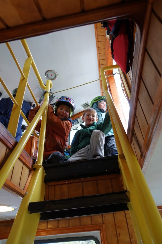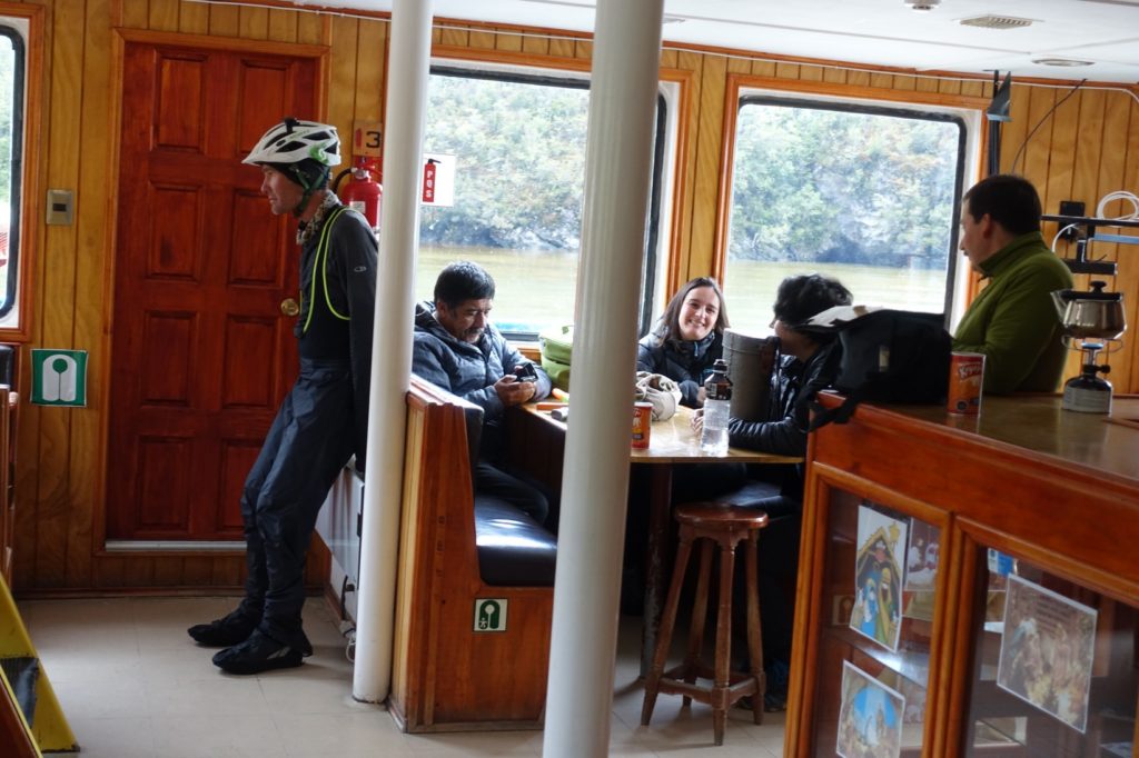Délivrance ! Nous pouvons monter à bord. Nous sommes les premiers. Nous posons les vélos et montons à l’étage. Bonne surprise, il y a du chauffage. Nous allons pouvoir sécher un peu ! Les enfants se font des copains, ils sont sympas, ils leur donnent à boire et à manger et leur prêtent leurs jouets.