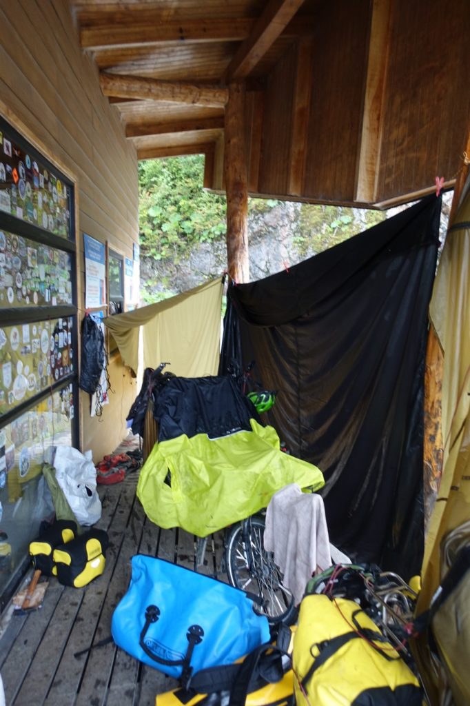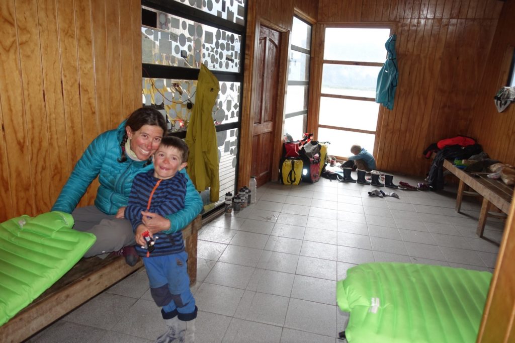 Nous étendons notre équipement de camping comme nous pouvons histoire qu’il sèche un peu. Nous nous installons et préparons de quoi dîner. Les enfants vont vite se coucher. Maman rattrape les articles en retard pendant que Papa change les rayons de sa roue. Ça change tout d’être à l’abri !