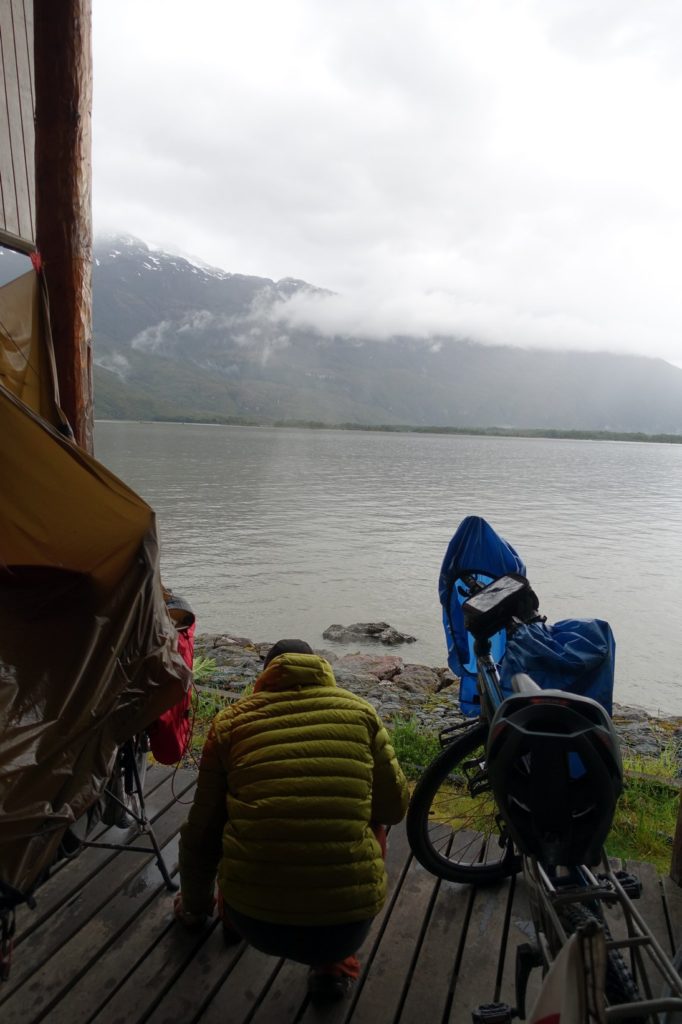 Nous rangeons tout plutôt lentement. Jason, lui, part rapidement. Il veut attraper le bateau assez tôt pour continuer de rouler. Nous plions la tente, le tapis de sol et le tarp. Tout est trempé ! C’est seulement à midi que nous nous mettons en route. Heureusement, nous n’avons que 28 kilomètres à faire et la dernière barge est à 18h00. Ça nous laisse le temps.