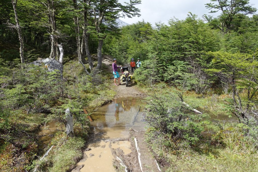 Nous poussons les vélos, heureusement pour nous, ils sont moins chargés que d’habitude. Comme prévu, nous traversons des rivières avec ou sans « pont ». Nous portons les vélos selon le niveau d’eau (parfois au-dessus du genou) ou pour passer des troncs d’arbre en travers du chemin. Les enfants marchent et traversent seuls quand ils le peuvent, sinon ils se font porter.