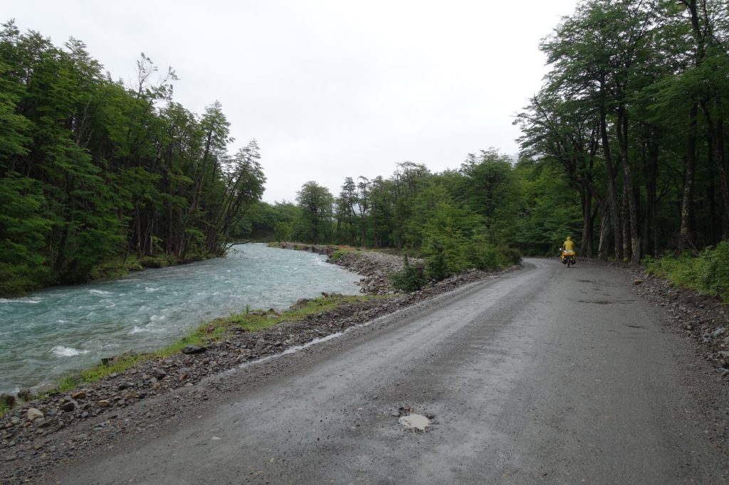 Nous chargeons les vélos, les enfants s’installent sous les ponchos et nous partons. La pluie et les nuages nous cachent le paysage, comme à leur habitude… Au moins, nous profitons de la rivière, elle a de belles couleurs !