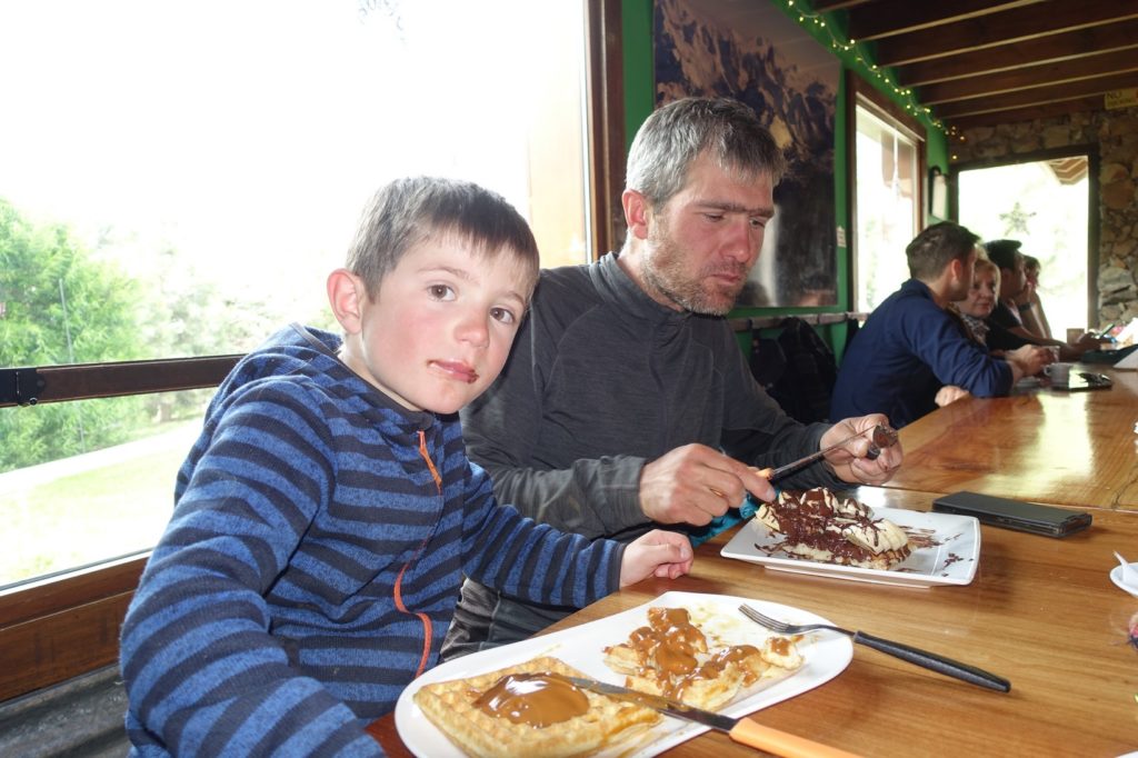 Papa tente de trouver un endroit pour réparer son frein avant. En effet, depuis le trek, il ne freine plus vraiment… Mais personne n’a ce qu’il lui faut. Il va falloir attendre El Calafate. Il en a profité pour nous ramener le déjeuner, des empañadas.
