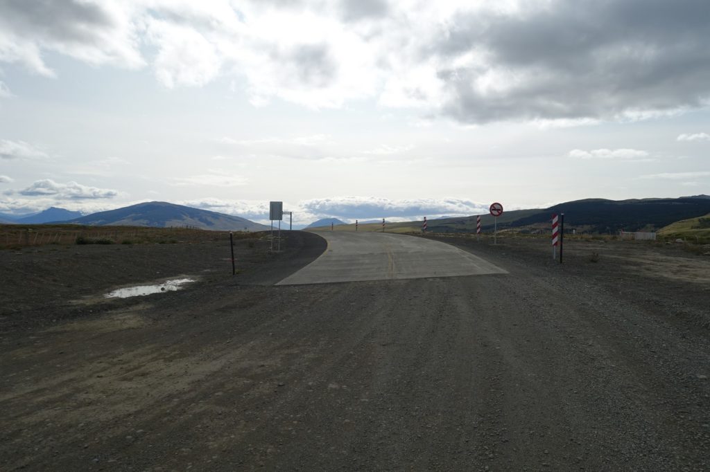 Nous y faisons une pause grignotage. C’est maintenant de la piste qui nous attend sur environ 8 kilomètres. Nous sommes soulagés en la voyant, elle est bonne, en descente au début, et en plus, nous tournons et avons le vent quasiment dans le dos. Le poste frontière argentin est vite en vue !