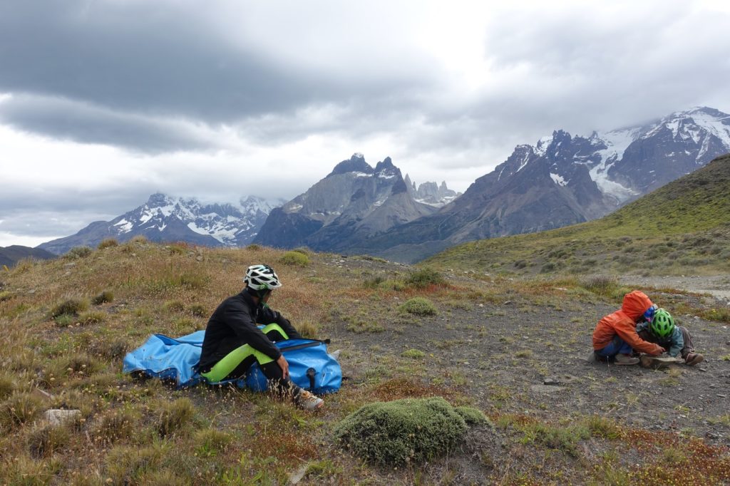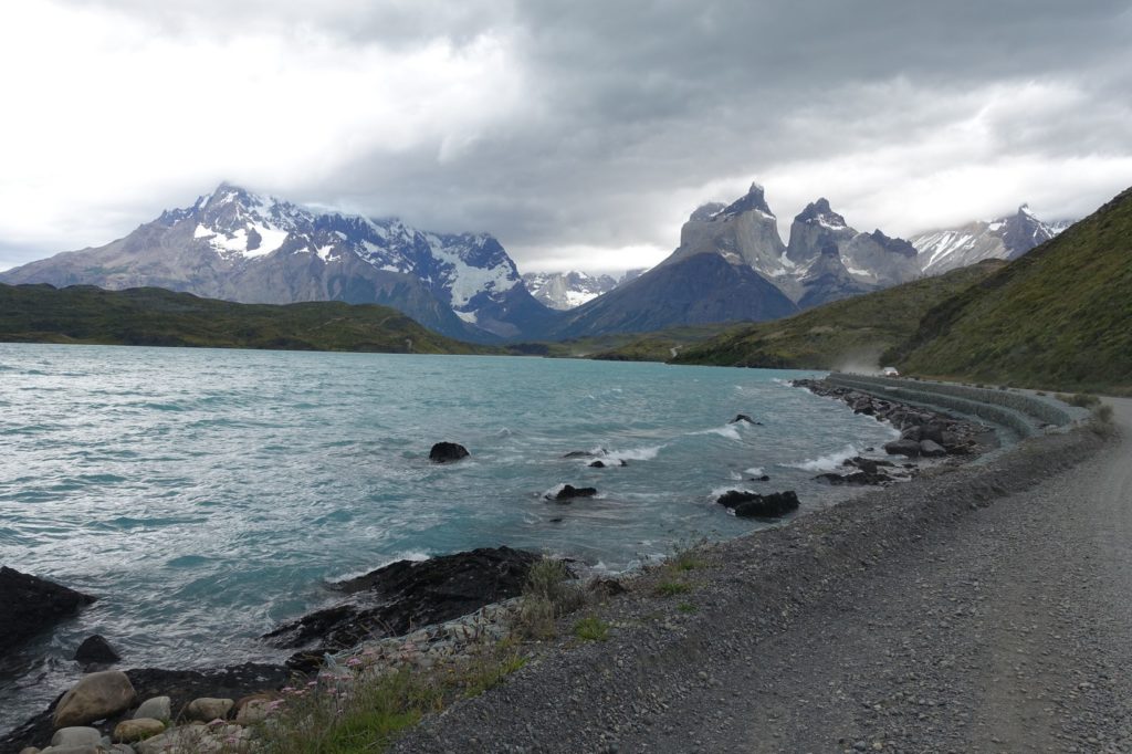 Lago Pehoe en vue ! Il y a des vagues comme si nous étions à la mer ! Les dernières côtes nous donnent du fil à retordre, ce sont des murs ! Il nous faut pousser à nouveau.