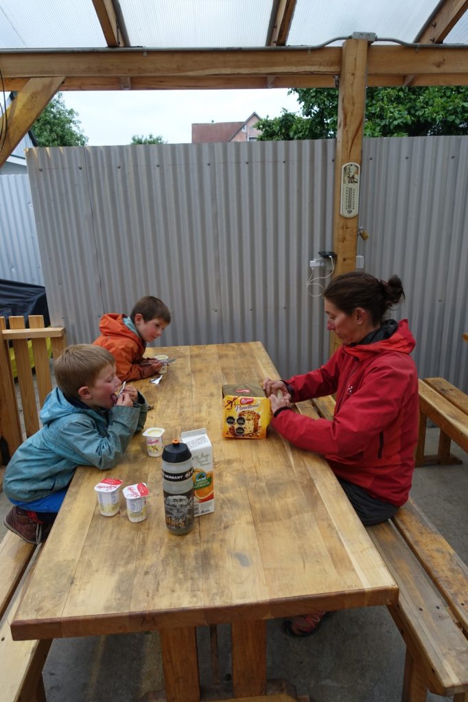 Nouvelle sonnerie, ce coup-ci, c’est la bonne ! Nous nous levons, pour une fois, les enfants ne traînent pas. Nous prenons le petit-déjeuner dehors, il ne fait pas froid, nous sommes bien. Tout est calme autour de nous. Nous sommes prêts vers 09h30 !