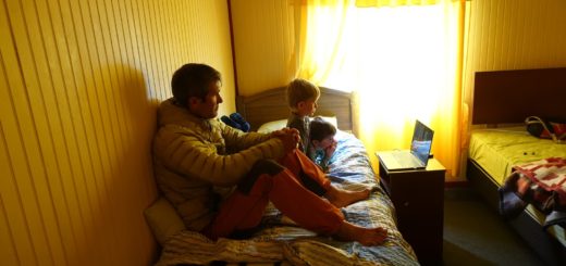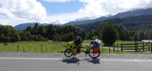 Enfin, la route devient bétonnée. Au sommet de la côte, il y a la grotte milodon mais nous décidons de ne pas la visiter. Nous y sommes accueillis par deux cyclistes, un français, Malo et un américain dont nous n’avons pas vraiment compris le nom. Malo nous dit avoir vu Mickaël et qu’il lui a parlé de nous. Ils partent tous les deux vers le nord. Nous prenons le temps de boire un café et un fanta puis nous repartons, nous ferons la pause déjeuner un peu plus loin.