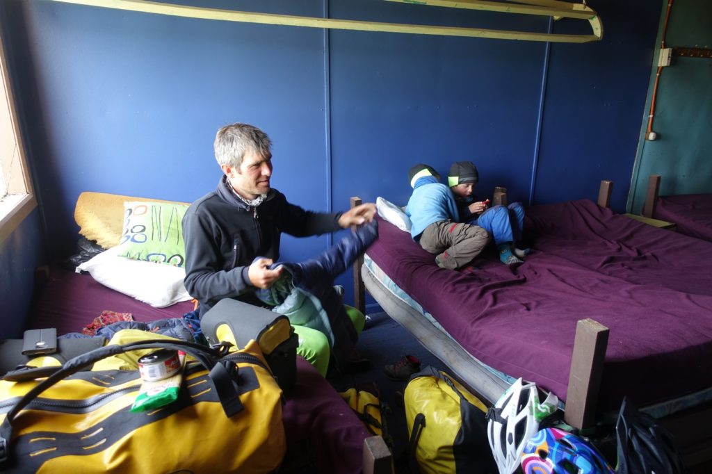 Il y a une station-service. Nous nous posons à l’abri pour prendre notre déjeuner. Puis nous allons nous poser à l’intérieur pour boire un café. Nous réfléchissons à la suite de la journée. Il y a une estancia juste en face où nous pourrions éventuellement rester. Sinon, nous pouvons continuer notre route mais le vent souffle fort et nous ne savons pas si nous pourrons nous arrêter chez les carabineros… Au final, nous sommes fatigués alors nous allons voir en face. Adolfo nous accueille et nous montre une petite cabane réservée aux travailleurs. C’est sommaire mais il y a des lits. Ça fera l’affaire pour ce soir. Un des employés se repose d’ailleurs.