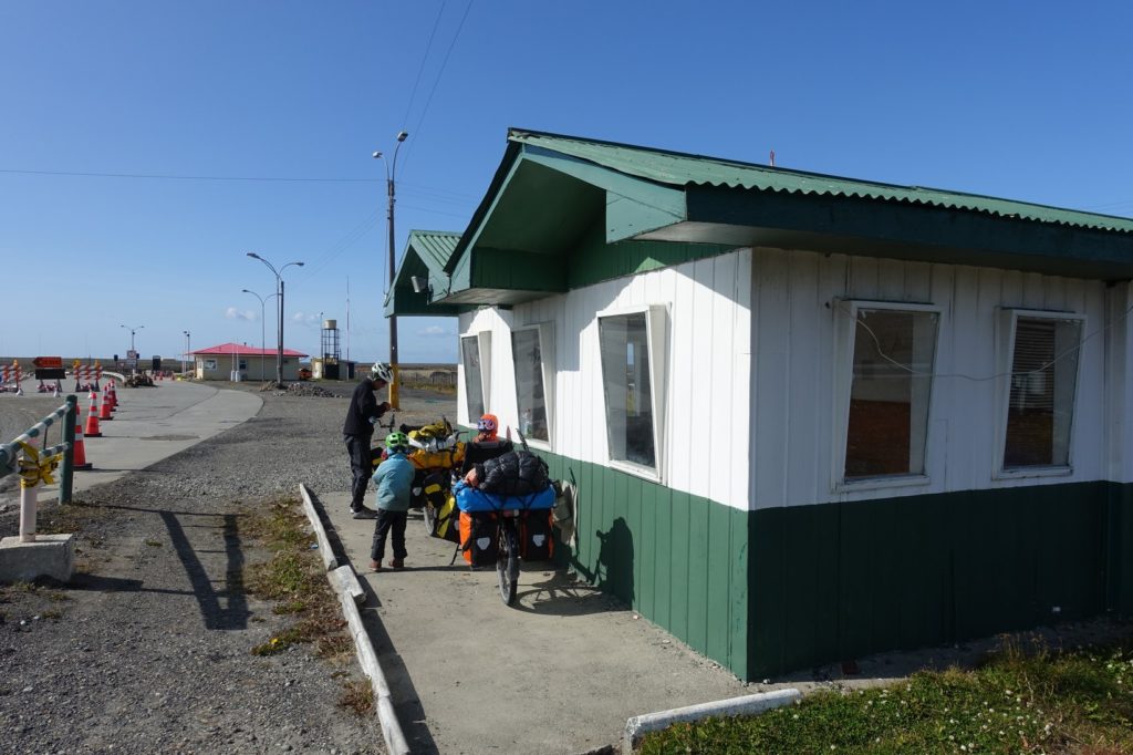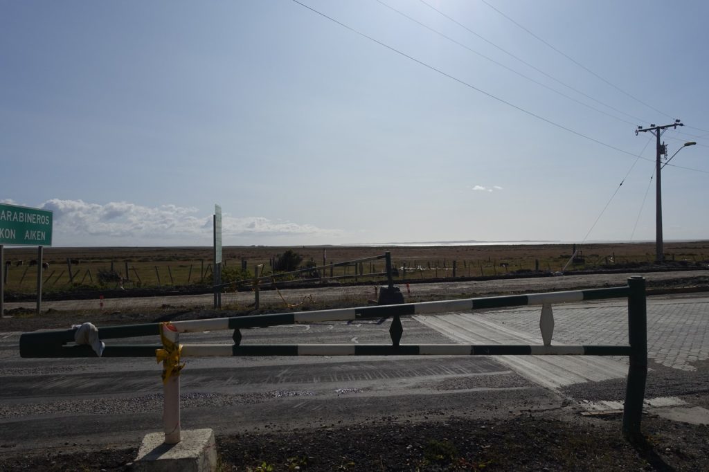 Le soleil ressort et nous continuons d’avancer. Nous allons moins vite qu’hier forcément mais nous atteignons le poste de police un peu après 10h00, soit 20 kilomètres de parcourus. Tout est fermé, abandonné, nous ne pouvons pas demander de l’eau ici. Nous aimerions en avoir pour ce soir au cas où nous nous arrêtions avant Punta Arenas. En effet, un peu plus loin, la route tourne et le vent va vraiment être de côté voire un peu de face. Tant pis, pour le moment, nous grignotons à l’abri du vent.