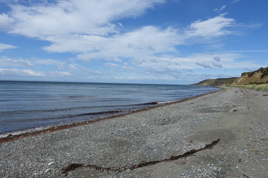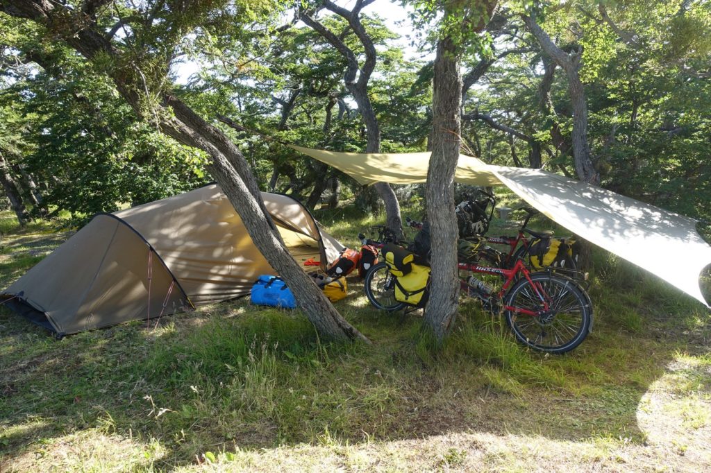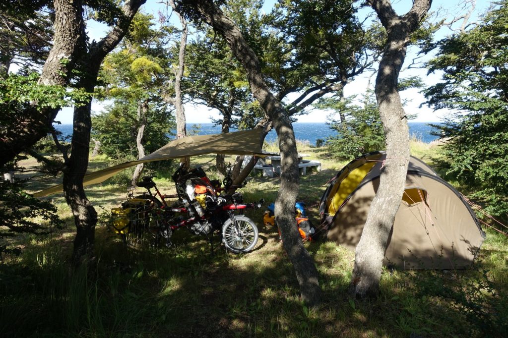 Nous continuons notre route. 3 kilomètres plus loin, il y a le parque Chabunco avec de nombreuses zones de camping. Nous cherchons un abri dans une zone boisée et trouvons notre bonheur. Il y a du vent mais beaucoup moins que sur la route. Nous sommes à un peu plus d’une vingtaine de kilomètres de Punta Arenas et demain il doit y avoir beaucoup moins de vent. La vue sur le détroit de Magellan finit de tous nous mettre d’accord !