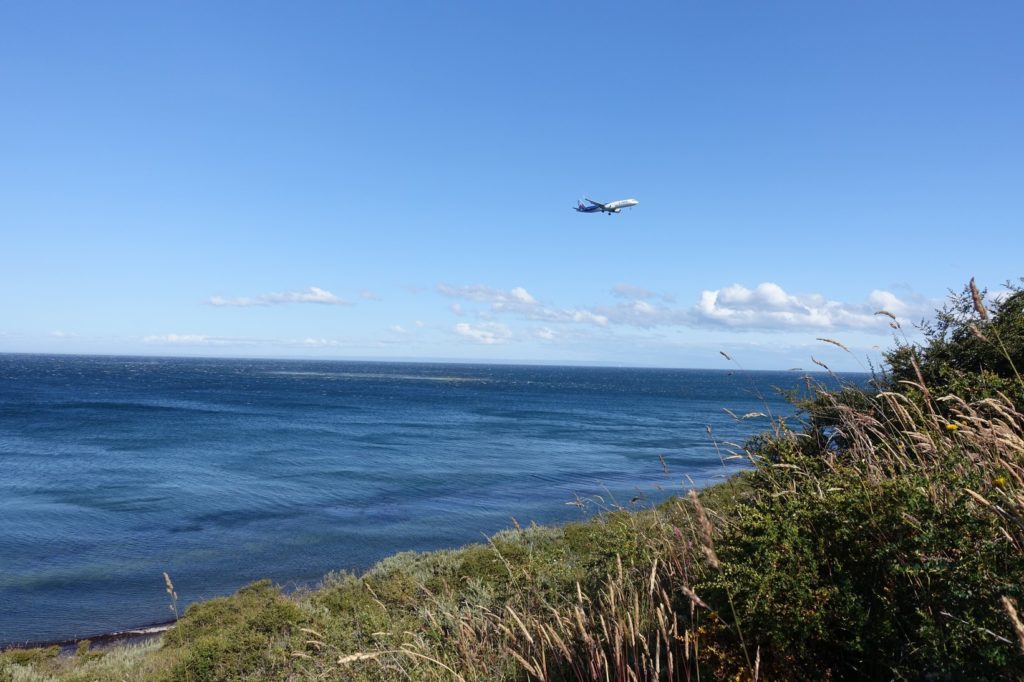 Nous installons la tente et le tarp. Quel bonheur d’avoir des fermetures-éclair qui fonctionnent ! Papa qui voulait à tout prix continuer est finalement très bien ici. Les enfants jouent, les parents profitent de la vue. Dur de voir des dauphins avec toutes les vagues. L’aéroport est juste derrière nous alors nous regardons aussi passer les avions.