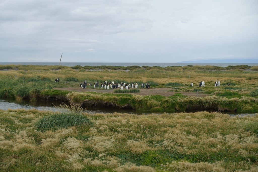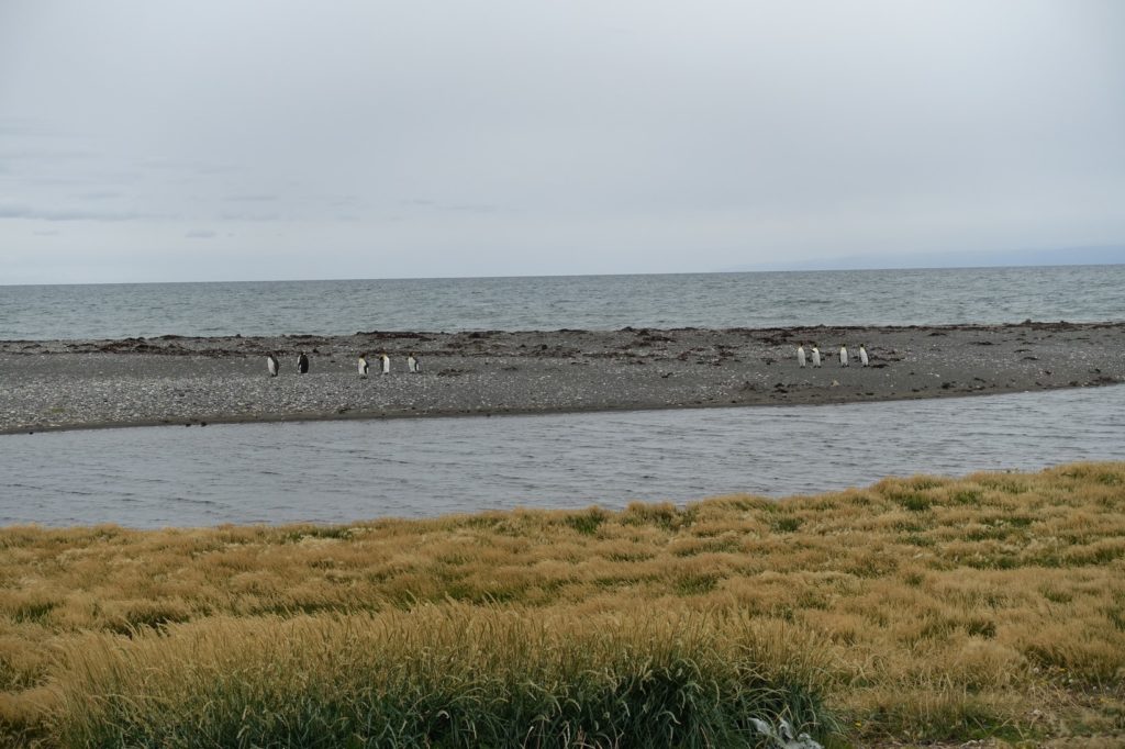 Voilà le parc au bord de la baie. Après un briefing, nous faisons notre pause déjeuner. Puis, avec entrain, nous attaquons notre visite ! Dans ce parc, nous pouvons voir des pingouins rois. Tout est fait pour les protéger, donc nous ne pouvons pas approcher de trop près mais des longues vues sont à disposition. C’est la période d’incubation des œufs, chacun leur tour, le père et la mère couvent. Nous pouvons voir les bourrelets près de leurs pieds. Nous assistons aussi au repas d’un petit fraîchement né. C’est magique. Martin apprécie vraiment, il est émerveillé, Lucas semble un peu moins intéressé. Les parents sont vraiment heureux de leur côté, ils sont comme des enfants !