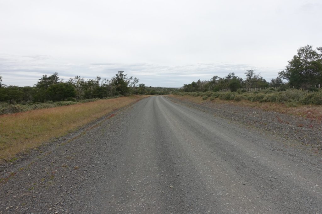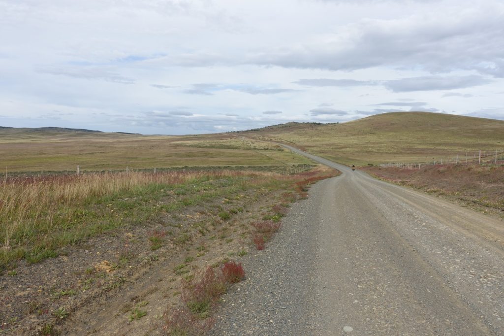 Nous repartons, la route tourne et nous avons le vent qui nous aide. Nous croisons un cycliste ! C’est un hollandais, il vient de partir d’Ushuaïa et monte vers Santiago.
