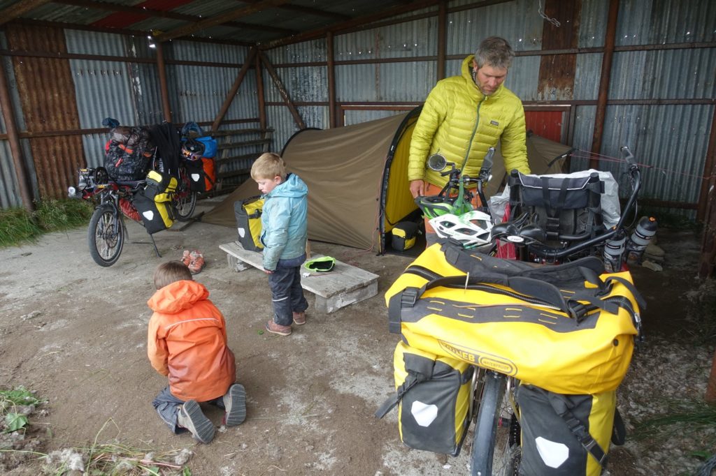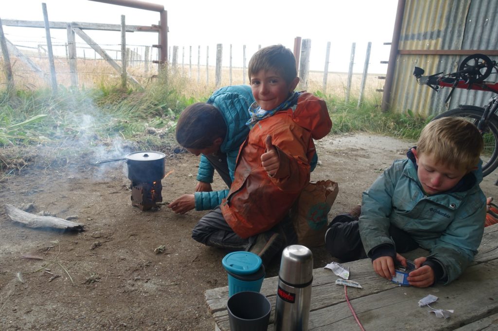 La nuit s’est bien passée, y compris pour Lucas. Le baume de Claudia (de Chilecito) a du lui faire du bien. Ce matin, la pluie se met à tomber quand le réveil sonne. Papa se dépêche de se lever pour mettre les vélos à l’abri. Puis les parents lancent le réchaud à bois. Au final, l’eau bout assez vite. Quand elle est quasiment prête, ils vont lever les enfants, c’est toujours aussi facile…