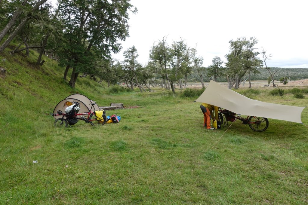 Nous faisons notre pause déjeuner. Ça se sent que nous avons manqué de nourriture sur les derniers jours de piste, nous avons plein de choses à manger ! Pâtes, œufs, avocats, tomates cerises, jambon, fromage et pommes ! Un vrai festin ! Tolhuin n’est plus qu’à 38 kilomètres mais les enfants ont envie de camper ici alors nous nous arrêtons.
