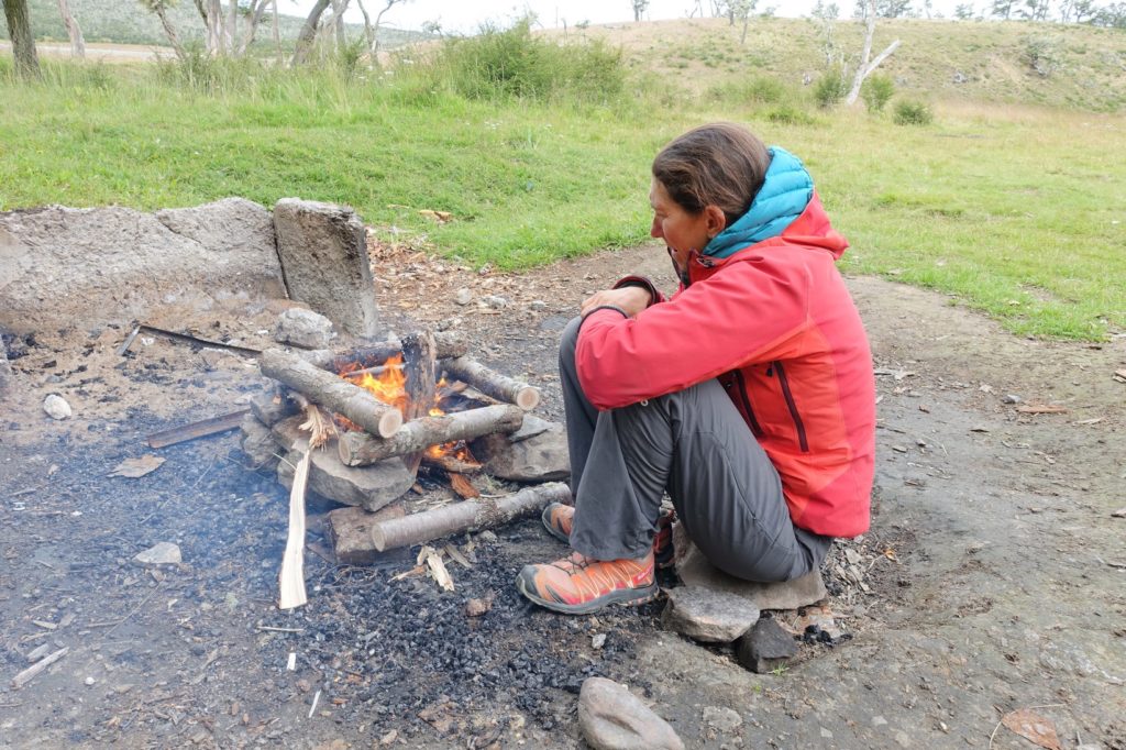 Nous mangeons autour du feu et nous couchons tôt ! Demain, le réveil sonnera moins tôt, nous n’avons pas beaucoup de kilomètres à faire pour rejoindre la légendaire boulangerie de Tolhuin !