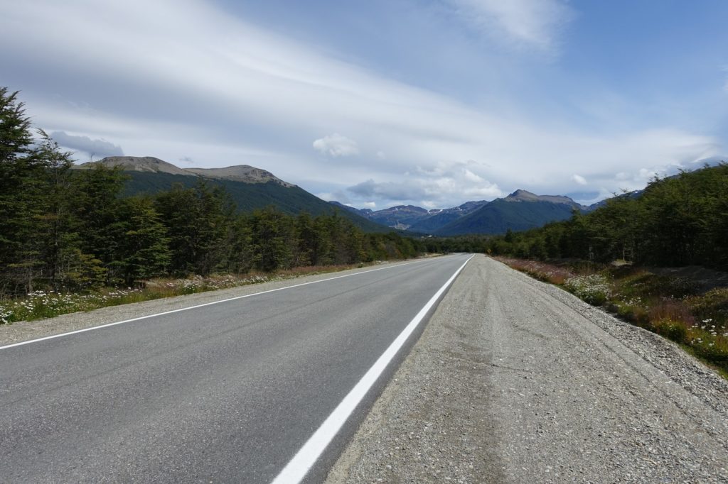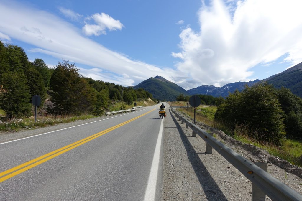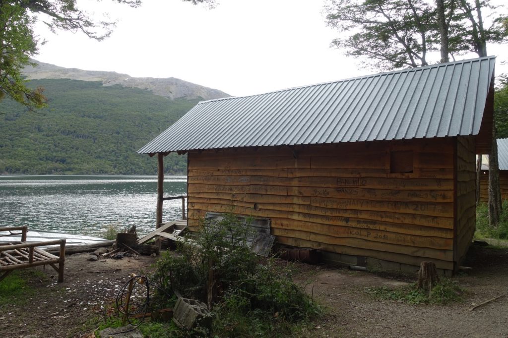 Nous sommes vite prêts, dehors, la pluie s’est arrêtée. Nous prenons le temps de boire un café en achetant du pain. Nous disons ensuite au revoir à Emilio et nous mettons en route. Un peu plus de 100 km à parcourir jusqu’à Ushuaïa. Nous allons les couper en deux étapes. A peu près au milieu, il y a un autre lieu bien connu des cyclotouristes, des cabañas abandonnées.