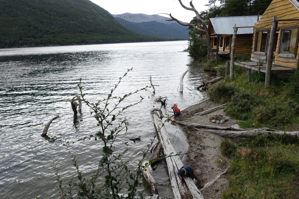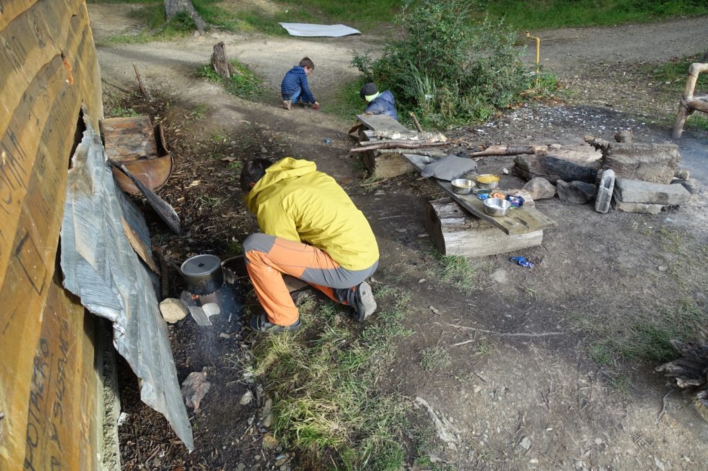 Nous ramassons du bois pour faire un feu, il n’est pas très sec mais nous parvenons à le mettre en route. Un couple de cyclistes argentins arrive. Il s’installe dans la cabane à côté de la notre. Papa lance le dîner mais nous avons un problème… Il y a une fuite ! L’essence coule et s’embrase le long du tuyau. Papa tente de resserrer le raccord, mais en vain, c’est peut-être le pas de vis qui est cassé. Nous sommes bien dégoûtés, de nouveau, nous n’avons plus de réchaud ! Nous sortons grumpy pour faire chauffer les pâtes. Ici c’est beaucoup moins rapide, le bois est beaucoup moins sec qu’à Pampa Guanaco ! Maman est bien contente d’avoir trimbaler un peu de bois ! Pendant ce temps, les enfants squattent avec les argentins.