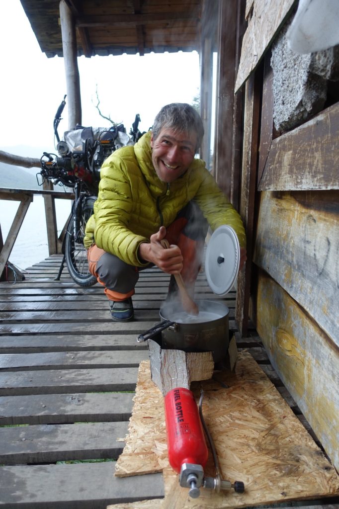 Il est maintenant l’heure de préparer le dîner. La pluie se met à tomber, c’est le déluge ! Le réchaud fonctionne parfaitement !