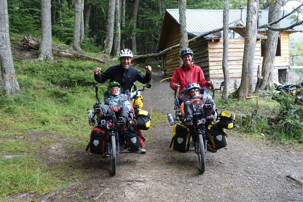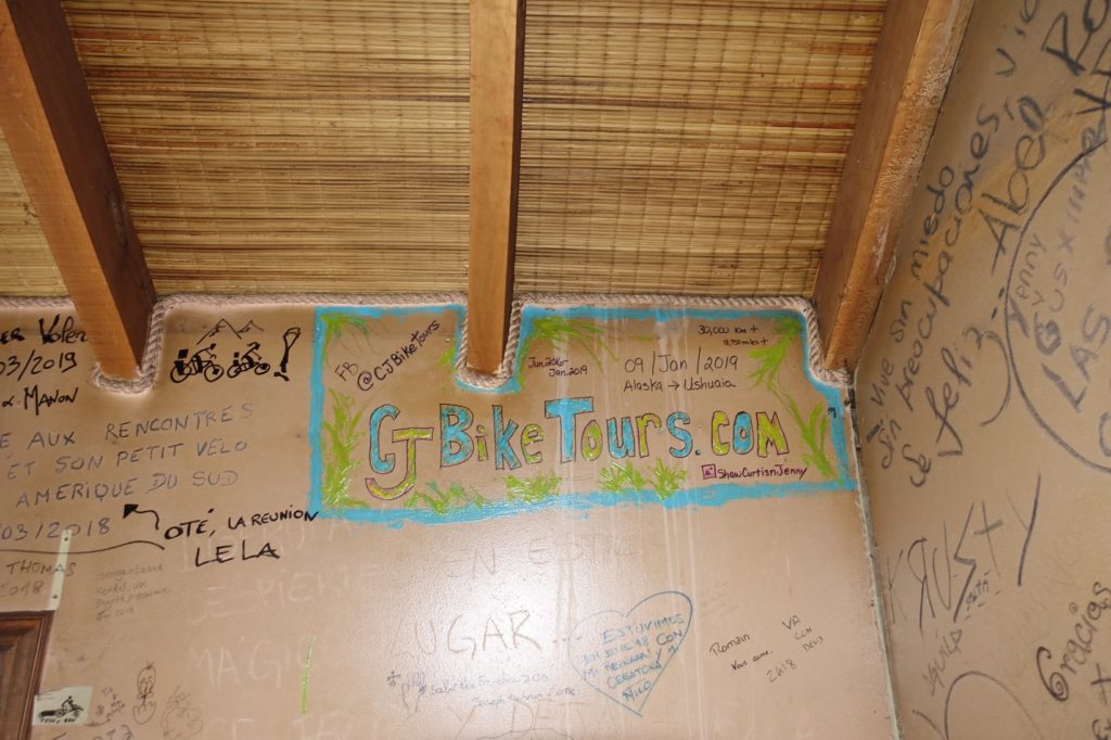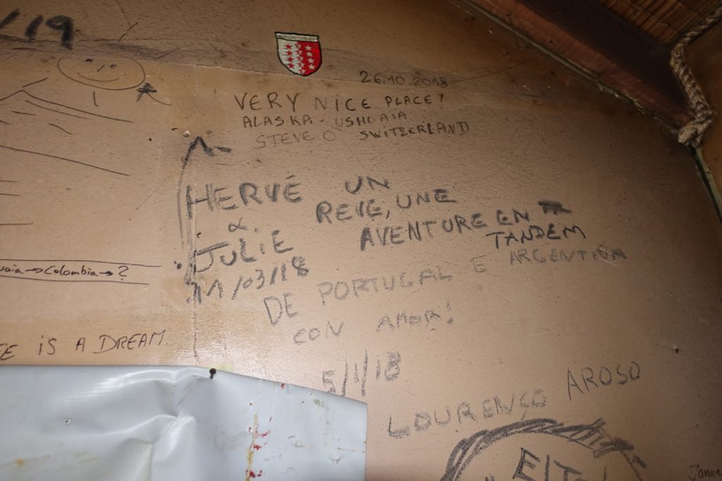 Nous prenons le petit-déjeuner, plions les affaires. Ça y est, la pluie s’est arrêtée ! Nous laissons notre trace sur les murs de la cabane et Papa ferme la porte. C’est la dernière fois qu’il ferme la porte d’un refuge avant notre arrivée à Ushuaia. Cela lui fait quelque chose…
