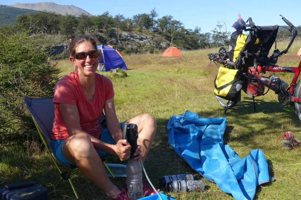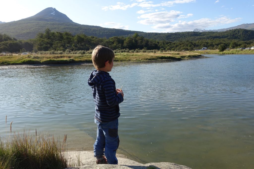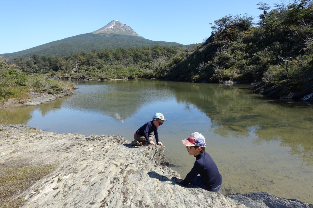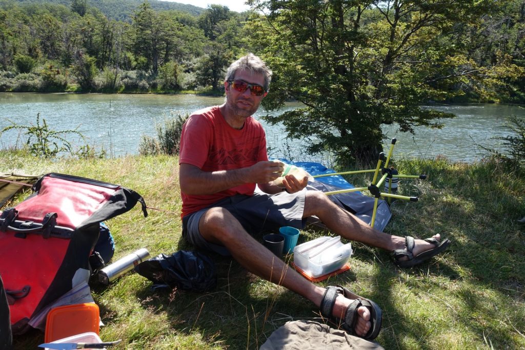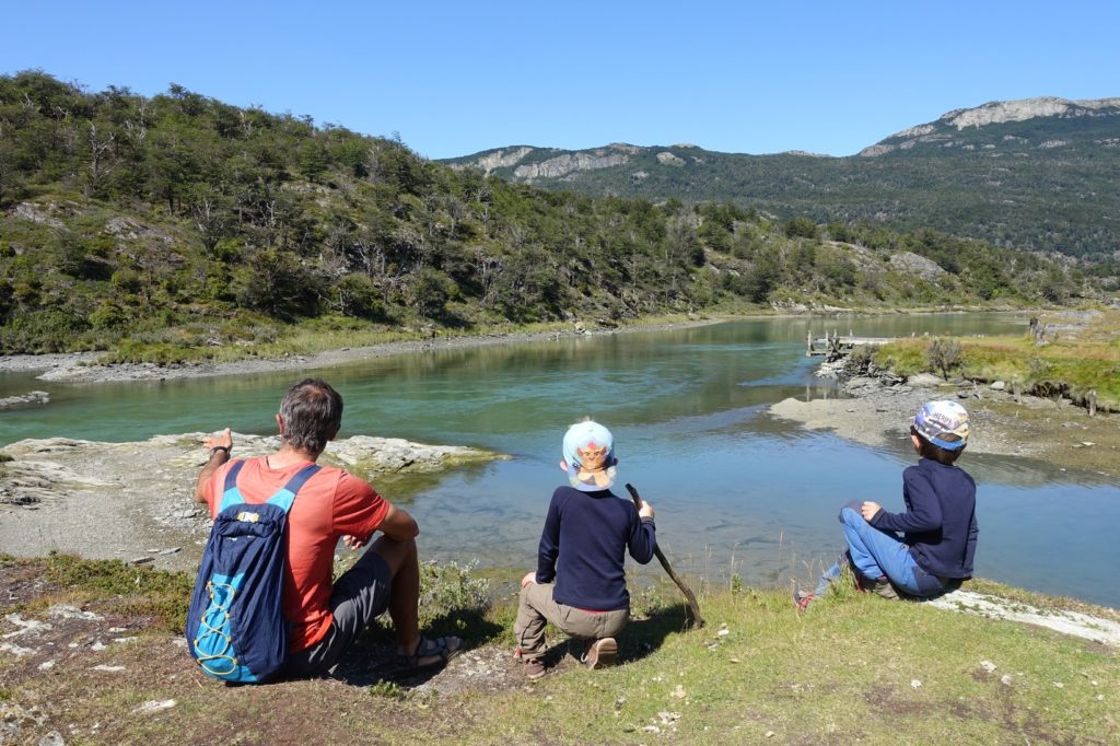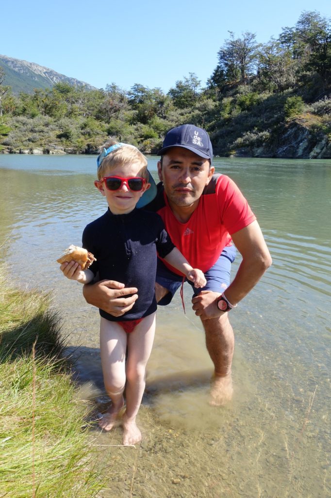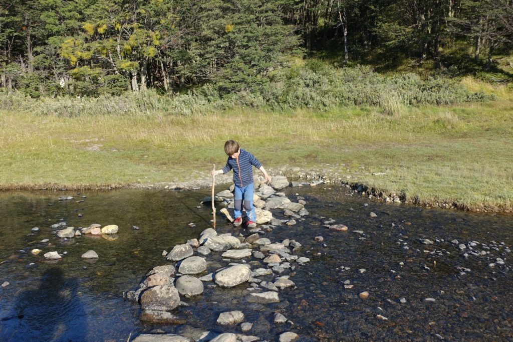 De retour au camping, nous prenons le déjeuner. Beaucoup de monde est arrivé ! Il y a des argentins partout. Il fait chaud, Martin et Lucas mettent les pieds dans l’eau froide de la rivière. Très rapidement, les pantalons sont mouillés, il faut les enlever ! Les parents sortent les shorts, c’est l’été !