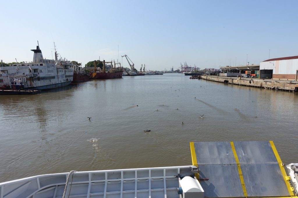 Nous passons la douane avec nos vélos, les bagages sont reniflés par un chien, le douanier blague avec nous. Nous passons ensuite au bureau pour avoir notre tampon de sortie d’Argentine et notre tampon d’entrée en Uruguay. Ça va vite ! Même pas encore monté sur le bateau que nous sommes déjà en Uruguay… Nous n’attendons d’ailleurs pas très longtemps pour pouvoir embarquer. Le bateau part à l’heure. Sorti du port, il accélère, nous ne mettons pas longtemps pour traverser le rio et arrivons a Colonia.