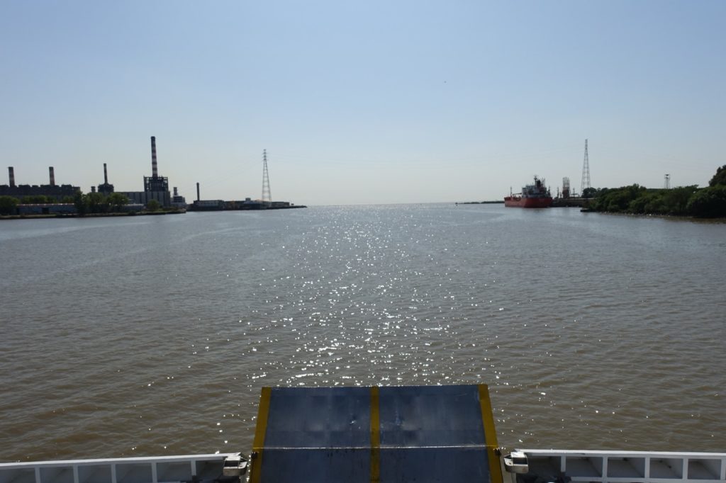 Le réveil est très difficile ce matin mais il nous faut nous dépêcher. Les parents prennent le petit-déjeuner et laissent les enfants dormir le plus longtemps possible. Papa va chercher les vélos, Maman range les affaires et commence le ménage (rapide). Tout est vite prêt, nous sommes efficaces. Nous levons les enfants tant bien que mal. Nous chargeons les vélos. La fermeture du gros sac jaune décide de faire des siennes, forcément, à un autre moment, ça n’aurait pas été drôle… Mais nous réussissons a nous mettre en route dans les temps (sans oublier de poser les clés dans la boite aux lettres). Nous suivons la piste cyclable de notre petite rue, ça nous permet d’être tranquilles et de ne pas trop affronter la circulation. nous arrivons au ferry a l’heure, faisons le check-in et buvons un café.