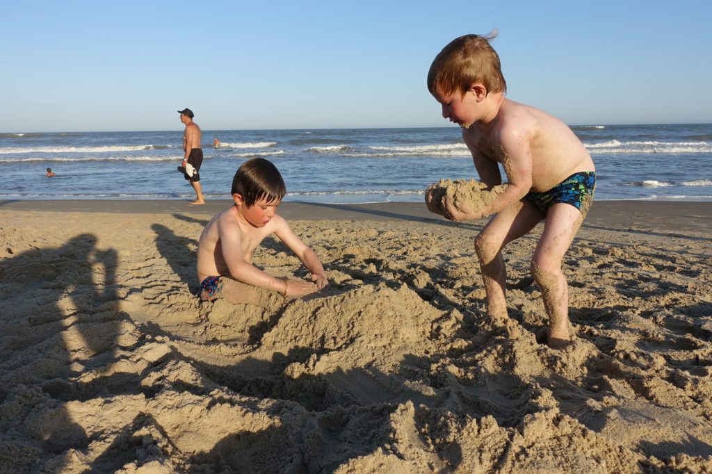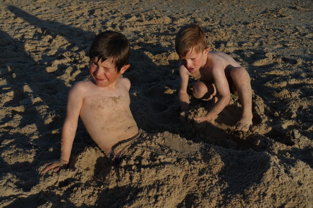 Elle est super, il y a de l’ombre (même si avec notre arrivée tardive, nous n’en avons pas vraiment besoin…). Nous sautons dans l’eau fraîche. De nouveau, les enfants sont joyeux et ils se régalent. Il n’y a plus moyen de les arrêter. Nous voulons y aller mais ils passent leur temps à retourner dans l’eau et à se rouler dans le sable.