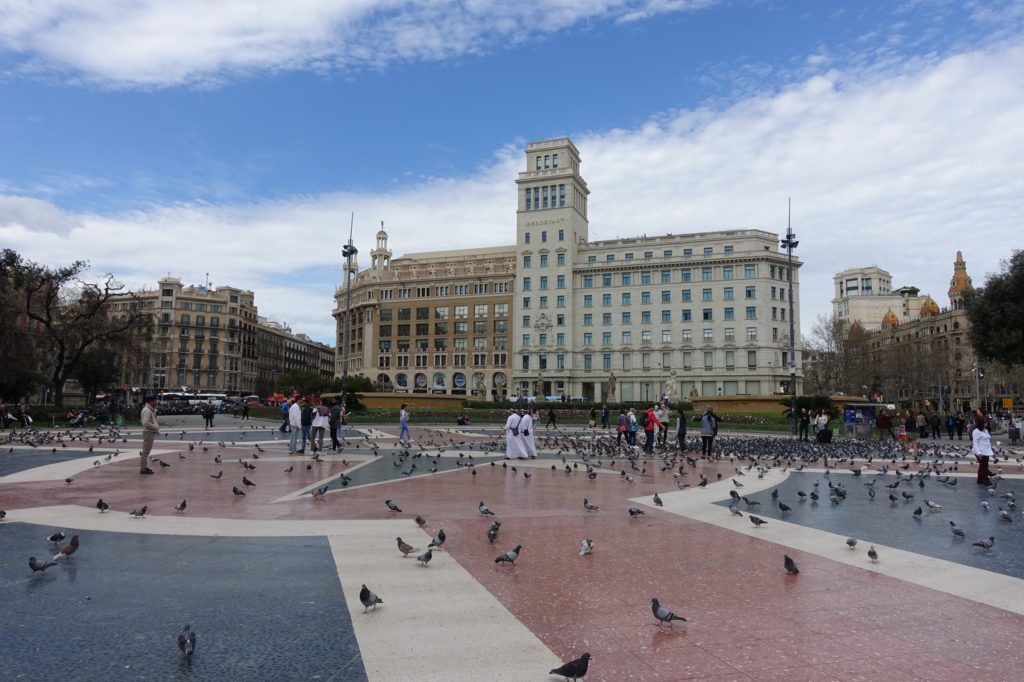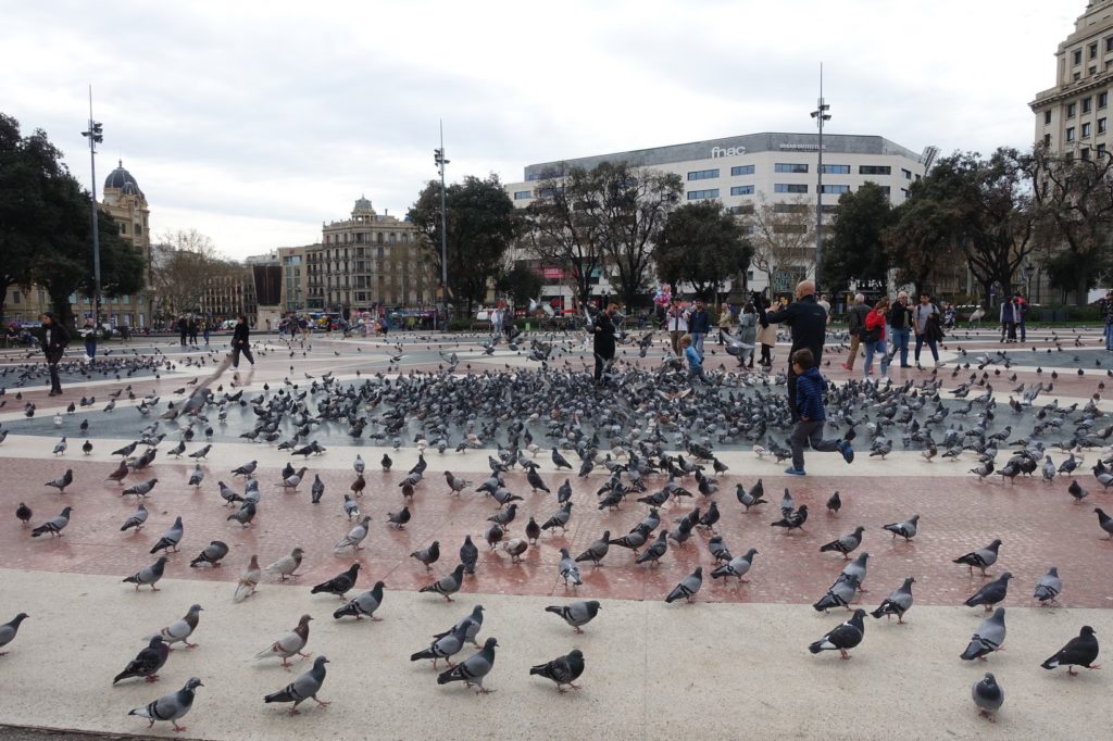 Martin et Lucas commencent à râler… Il est temps de trouver un endroit pour manger. Mais nous faisons d’abord une pause sur une place envahie par des pigeons.