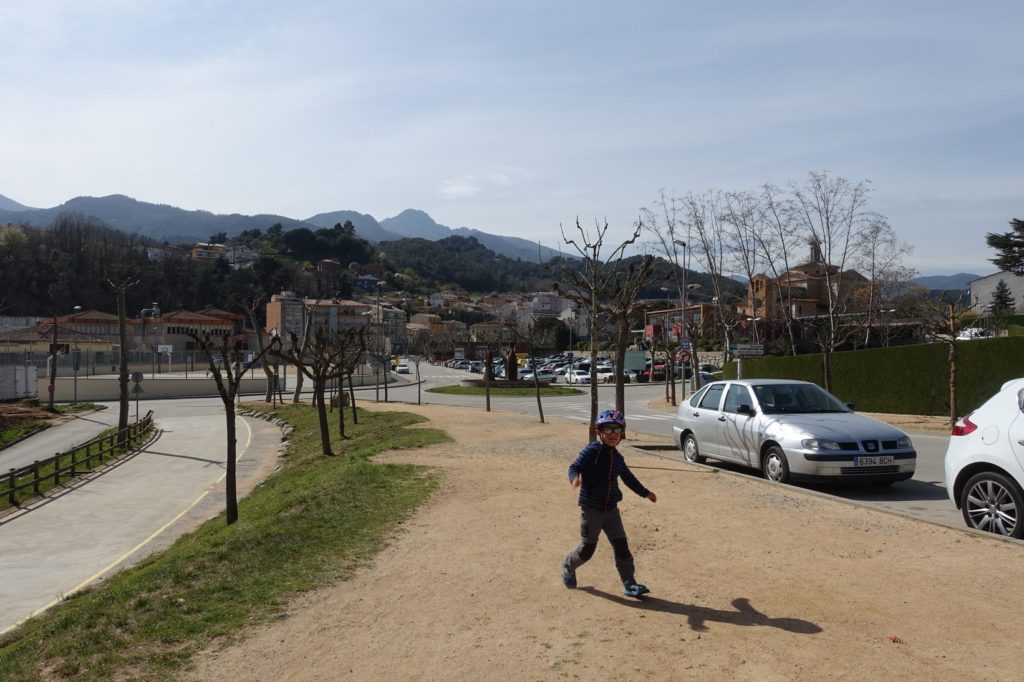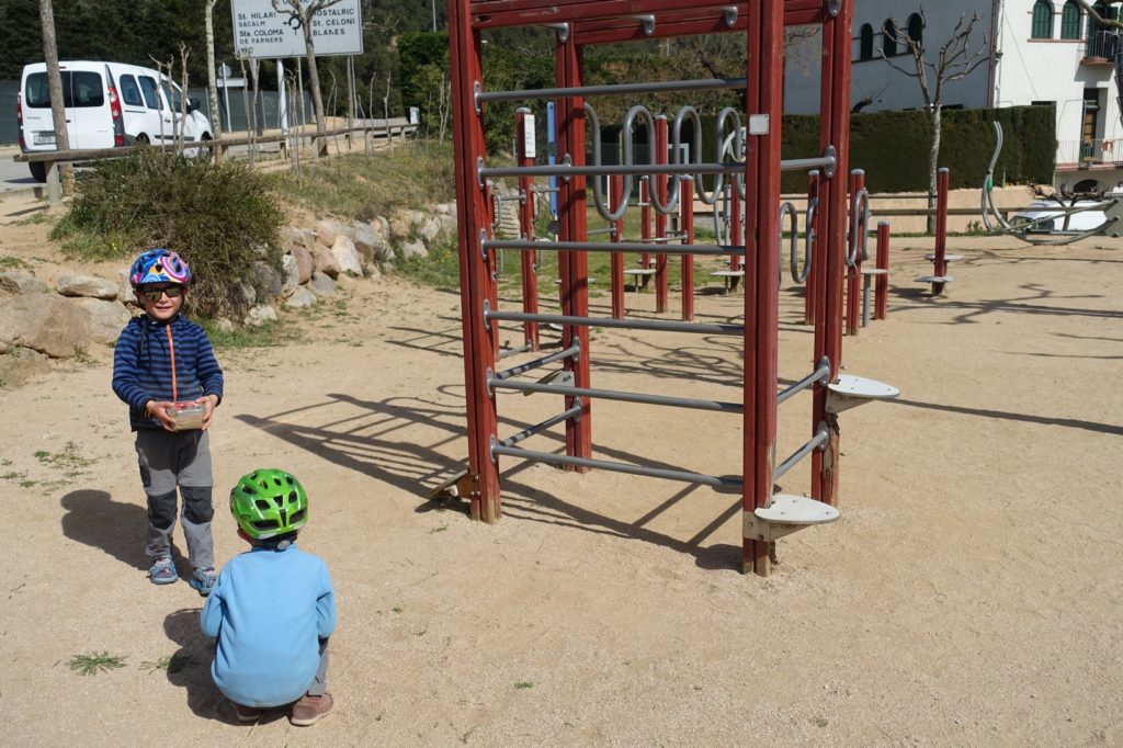 Pour le déjeuner, nous faisons halte à Arbucies. Faute de trouver des jeux, nous nous posons à une aire de sport. Chips, pain, jambon, fromage… Miam !