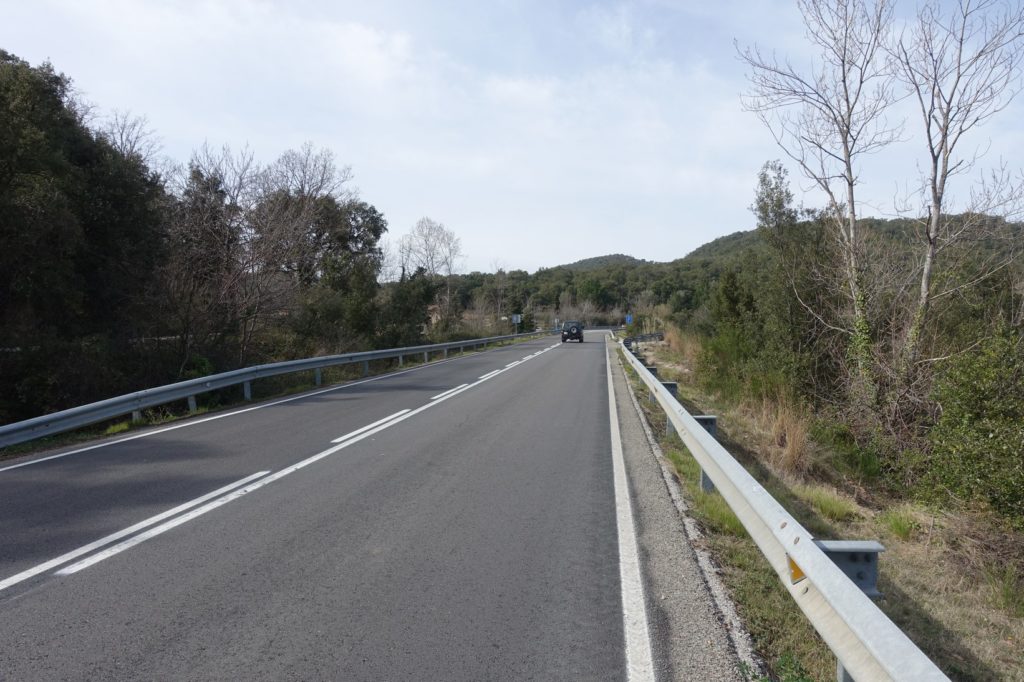 Et nous voilà partis sur cette route passante… Ce n’est pas des plus agréables mais globalement, les conducteurs font attention à nous. Reste une question, montagne ou vallée ? Avant de nous quitter, Victor nous a reconseillé la montagne (surtout qu’il fait beau). Papa veut passer par là… Maman se laisse convaincre. Ce sont donc un peu plus de 800m de dénivelé qui nous attendent aujourd’hui. Pour couronner le tout, nous coupons par Breda, ça nous rajoute encore quelques mètres de montée… Mais cela nous permet de quitter plus rapidement la route. L’un dans l’autre… Nous nous demandons tout de même si nous allons bien nous en sortir, ça fait un bail que nous n’avons pas fait de dénivelé !