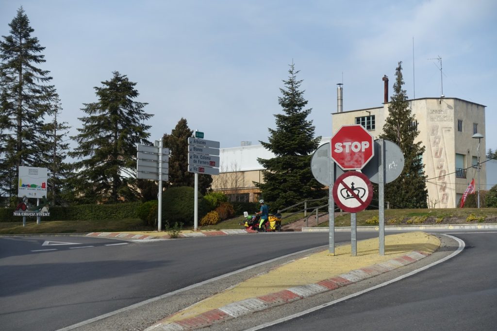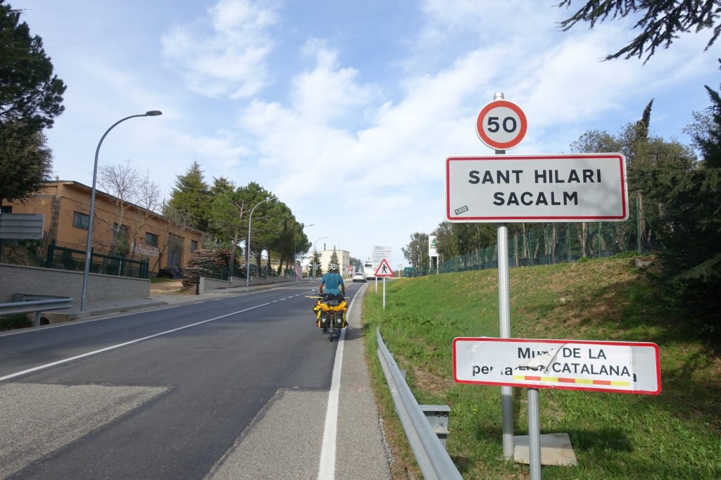 Nous faisons quelques pauses, surtout pour ménager le genou de Maman. Au final, nous mettons un tout petit peu plus de 2h00 ! Parfait ! Nous sommes fiers de nous pour le coup, nous ne sommes pas complètement rouillés. Nous voilà à Sant Hilari Sacalm, la ville porte bien son nom, y arriver ça calme (oui, elle est nulle mais il fallait la faire…). Ici aussi, il y a des traces du référendum… Sur les murs, il y a pas mal d’illustration (promis, nous prendrons des photos).