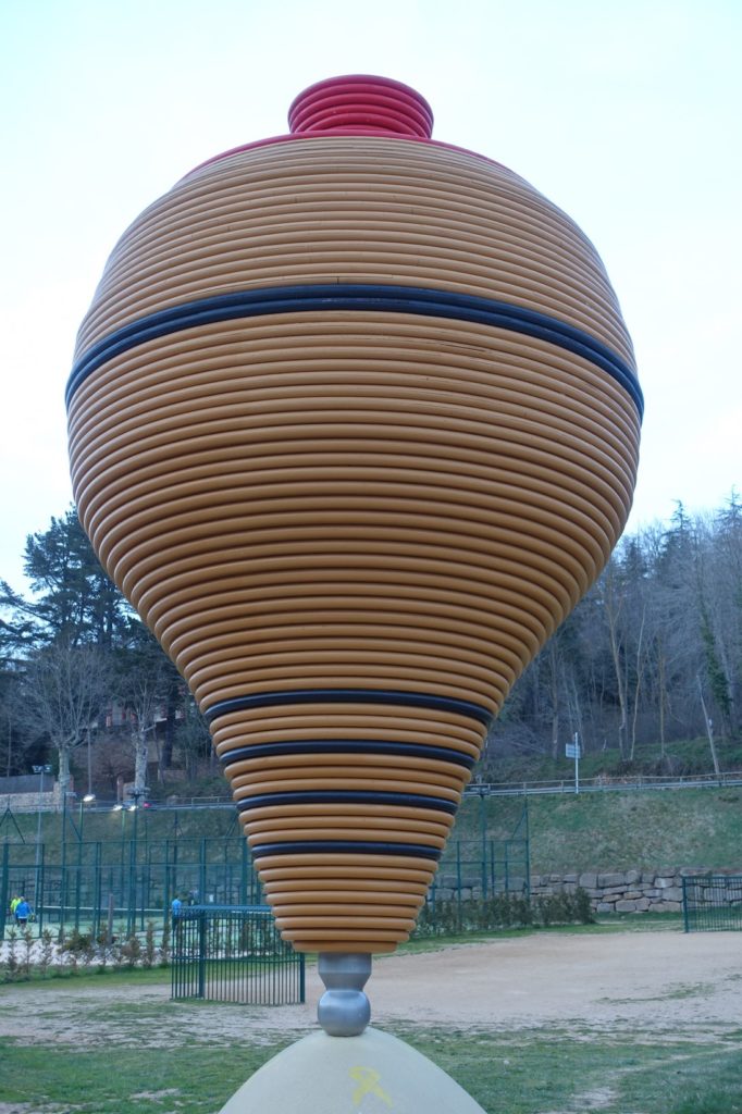 Reste à trouver où nous allons poser la tente. Nous allons remplir nos gourdes à une aire de camping-car. Il y a un petit coin avec de l’herbe et des tables, on ne devrait pas nous poser de problèmes ici. Il n’est que 17h30 mais il ne fait pas chaud. Nous montons vite la tente et préparons le dîner. Pendant ce temps, les enfants jouent dans la terre puis aux Lego dans la tente. Nous sommes à côté de le plus grande baldufa (toupie ?) du monde.
