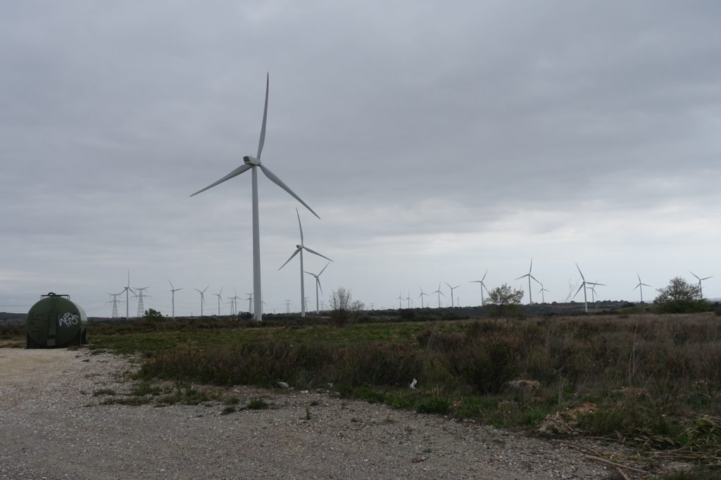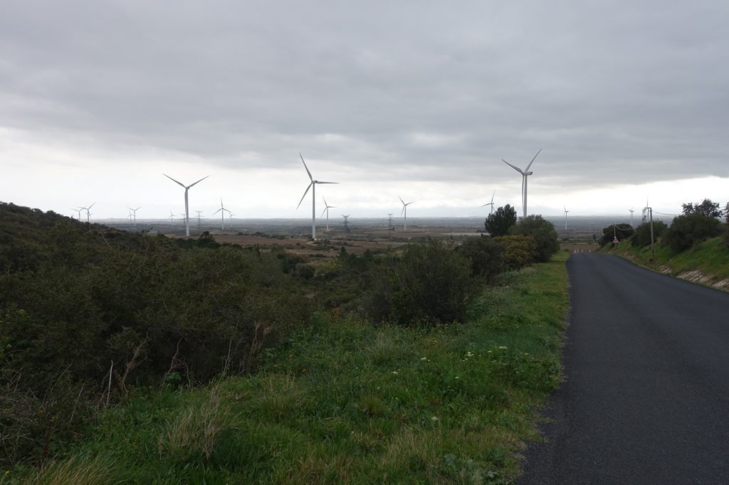 Puis c’est le deuxième col de la journée, le col de la Dona. Ils ne sont pas bien haut, les montées se font facilement. Cette fois, c’est un champs d’éoliennes que nous traversons ! Avec le vent qui souffle aujourd’hui, elles tournent vite et font un bruit d’enfer !