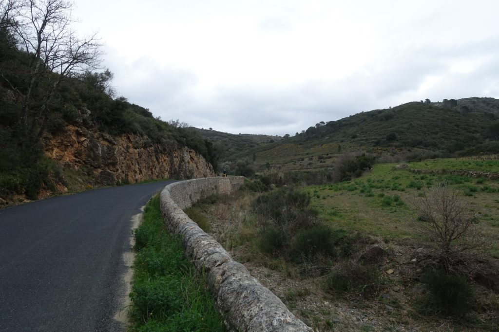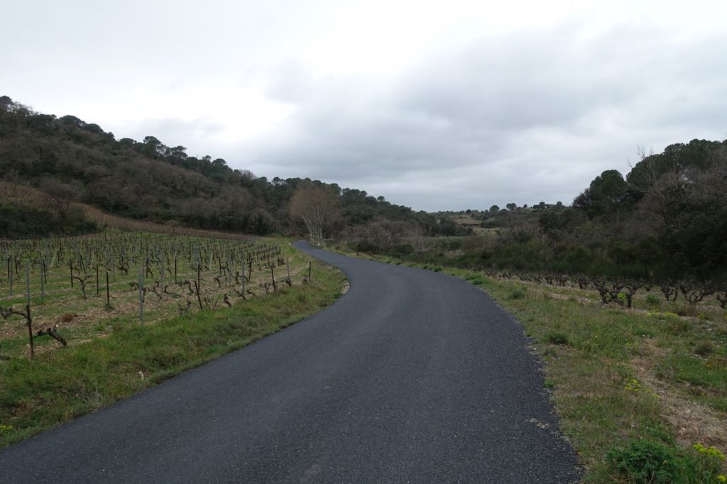 Nous terminons l’ascension du col de Llauro, nous sommes au milieu des arbres, c’est paisible. Nous découvrons également des vignes.