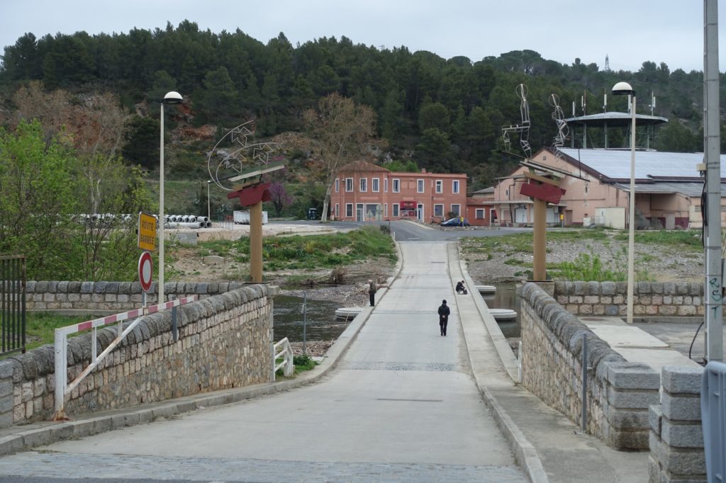 Nous faisons le plein d’eau à Estagel, encore un joli petit village. Ici aussi, tout est désert, les gens vont au bureau de vote, quelques-uns pêchent ou démontent la fête foraine qui a été annulée.
