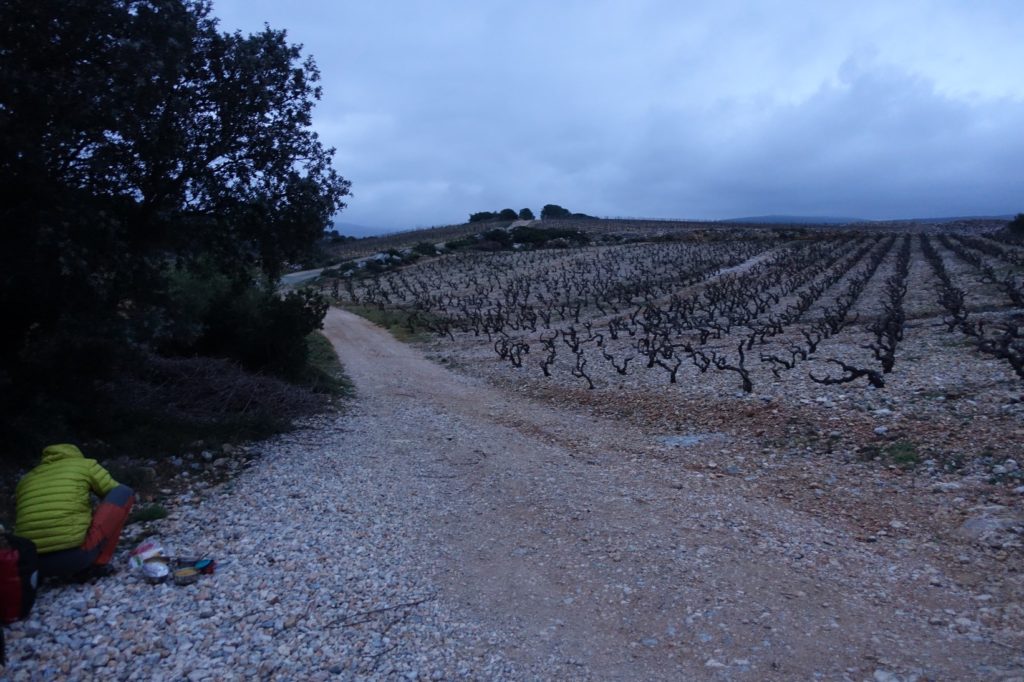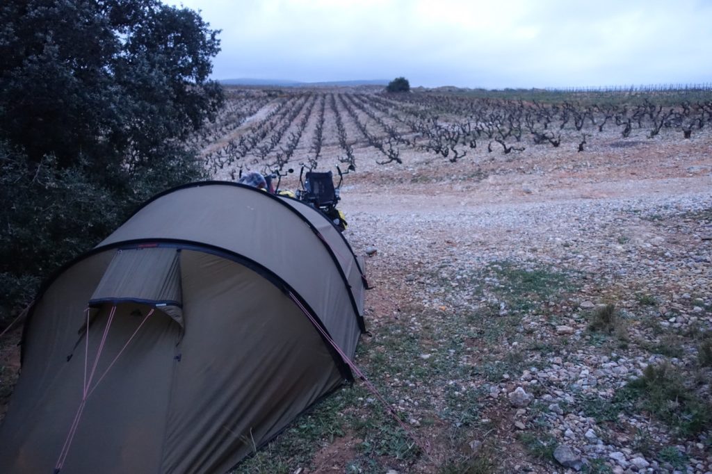 Nous montons dans les vignes, prenons un petit chemin et trouvons l’endroit presque parfait (il manque de plat). Nous plantons la tente à l’abri du vent. Nous avons des nouvelles du coronavirus… Ça ne sent pas bon du tout… Il faudrait peut-être songer à changer nos plans… Nous décidons donc de nous rapprocher de Narbonne. Là-bas, nous prendrons peut-être le train… Nous savons que grâce à Denis et Geneviève, nous aurons un toit en arrivant. Nous aviserons demain…