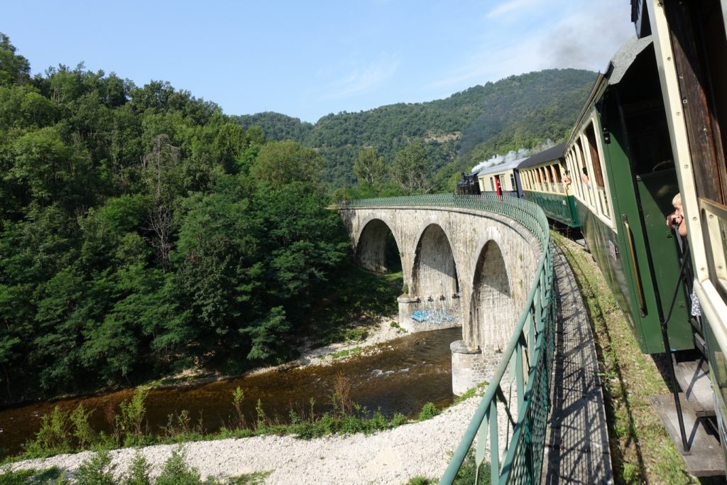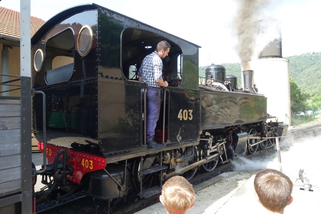 Réveil mis tôt, nous prenons vite la voiture pour rejoindre la gare de Tournon. les vélos sont chargés dans le train facilement et nous prenons nos places dans le Mastrou. La locomotive est magnifique.