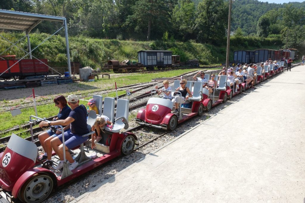 Pause à Boucieu-le-Roi, il faut faire le plein d’eau de la locomotive. Et nous découvrons les vélo-rails ! En voilà de drôles d’engins !