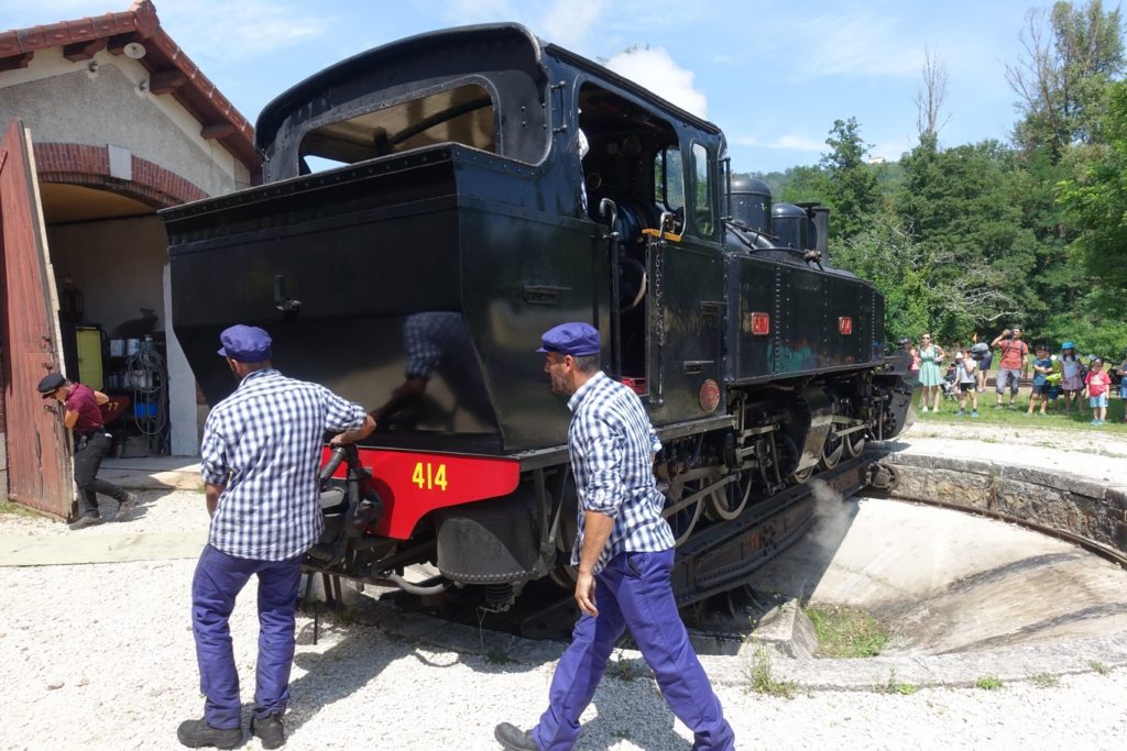 Lamastre ! Les vélos sont déchargés (et ils étaient loin d’être seuls dans le wagon !). Nous avons envie de pédaler mais nous décidons de commencer par manger et nous regardons le demi-tour de la locomotive.