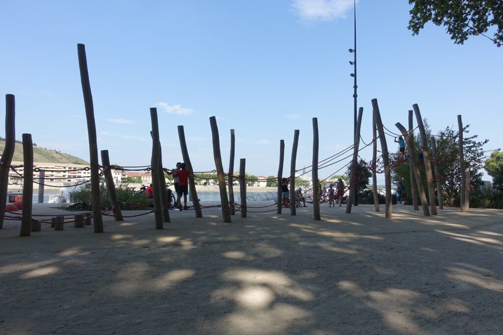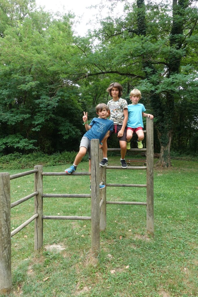 Le temps est un peu couvert, il fait lourd aujourd’hui. 10h45, nous faisons une pause à un robinet pour remplir les gourdes. Martin et Lucas voient une aire de jeux et se précipitent !