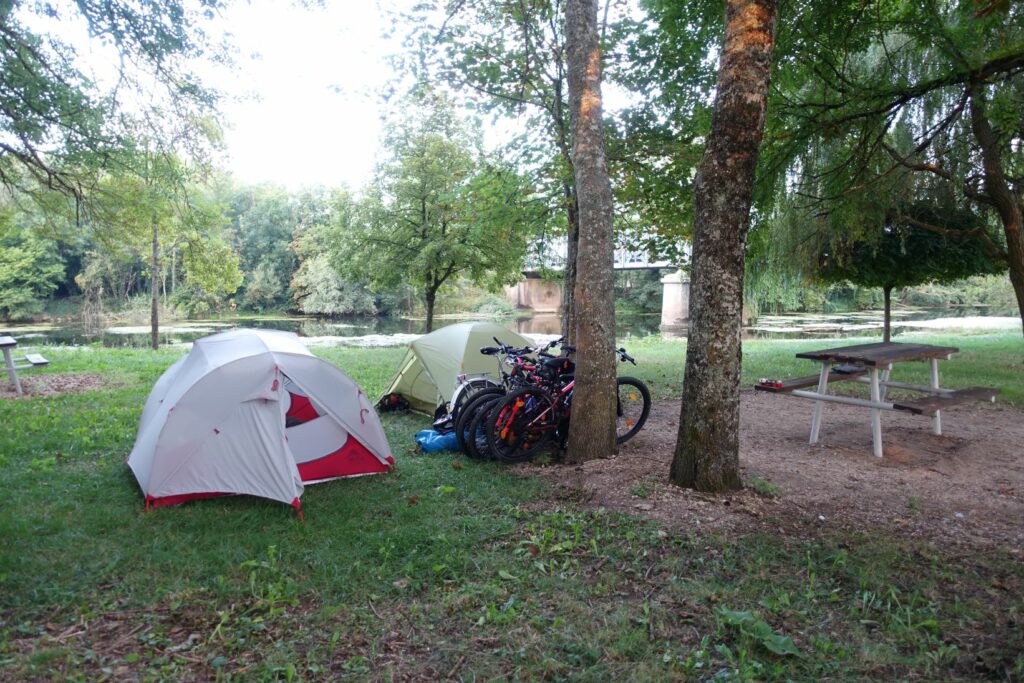 Enfin, le camping ! Il est déjà 18h00, en voilà une grosse journée ! Mais bonne nouvelle, nous avons accès à la piscine attenante ! Les enfants sont plus que ravis pour le coup et là, ils ne sont plus fatigués du tout. Nous posons vite les vélos sur un emplacement, prenons nos maillots et plouf ! Il faut dire qu’elle ferme à 20h00 alors il ne faut pas trop traîner.