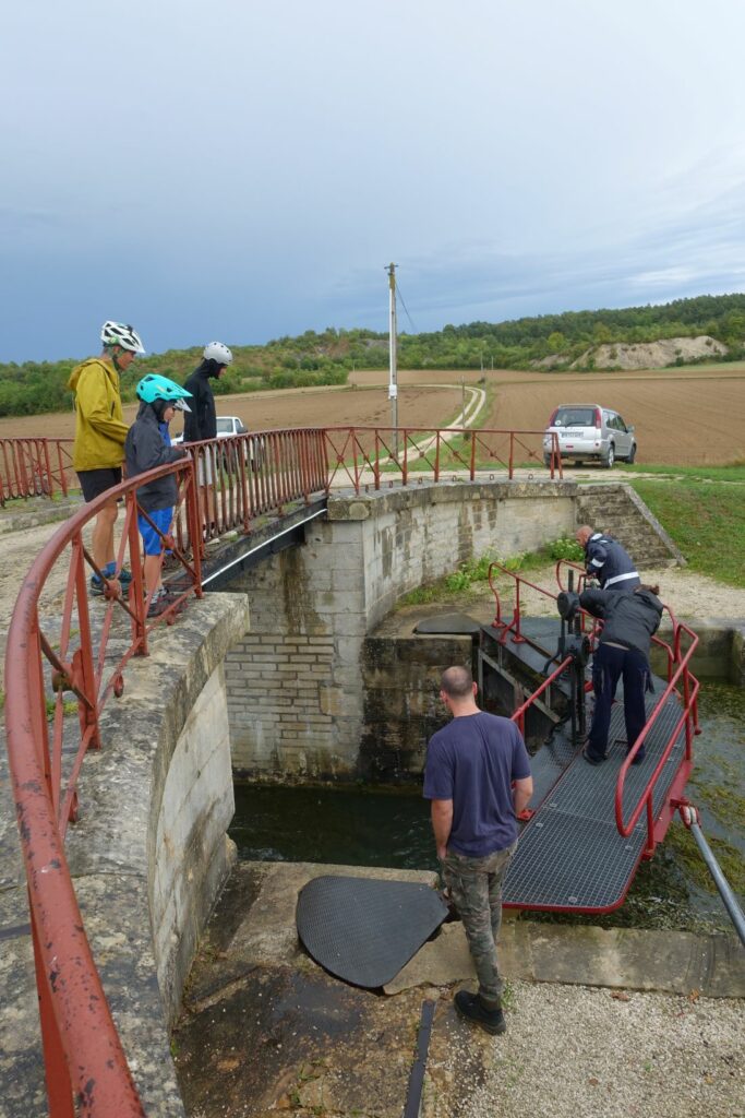 Au bout d’une heure, la pluie se calme et notre direction semble reprendre des couleurs. Il est déjà 15h00, nous reprenons nos montures. Au bout de quelques minutes, nous tombons sur une écluse en cours de manœuvre. En plus, il y a une personne en cours de nettoyage du canal sur une machine qui nous impressionne tous. Elle tangue d’avant en arrière, sur les cotés… Le conducteur n’a pas peur de finir à l’eau.