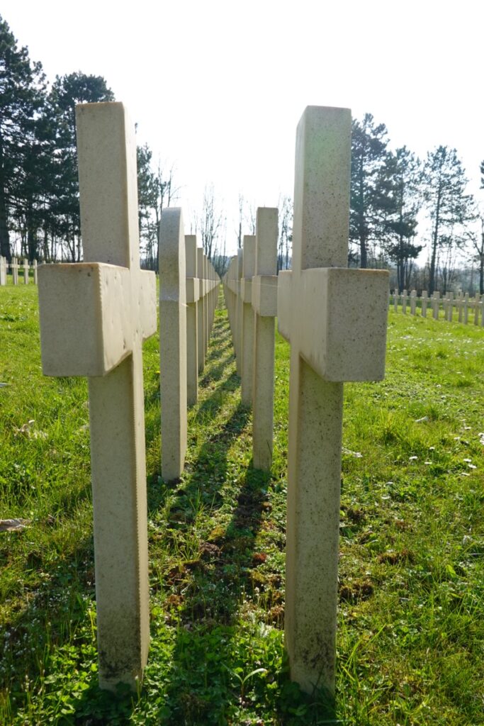 Nous ratons un embranchement, il faut dire que ce ne devait pas être une route mais plutôt un chemin. Nous arrivons donc à l’entrée de Rembercourt-aux-Pots. Quelle bonne idée de nous être trompés, cela nous permet de découvrir sa nécropole nationale. Elle regroupe les tombes de 5510 français décédés lors de la première guerre mondiale et deux ossuaires accueillant 3400 corps. Juste à côté, nous pouvons voir aussi une zone réservée aux 4976 soldats allemands.
