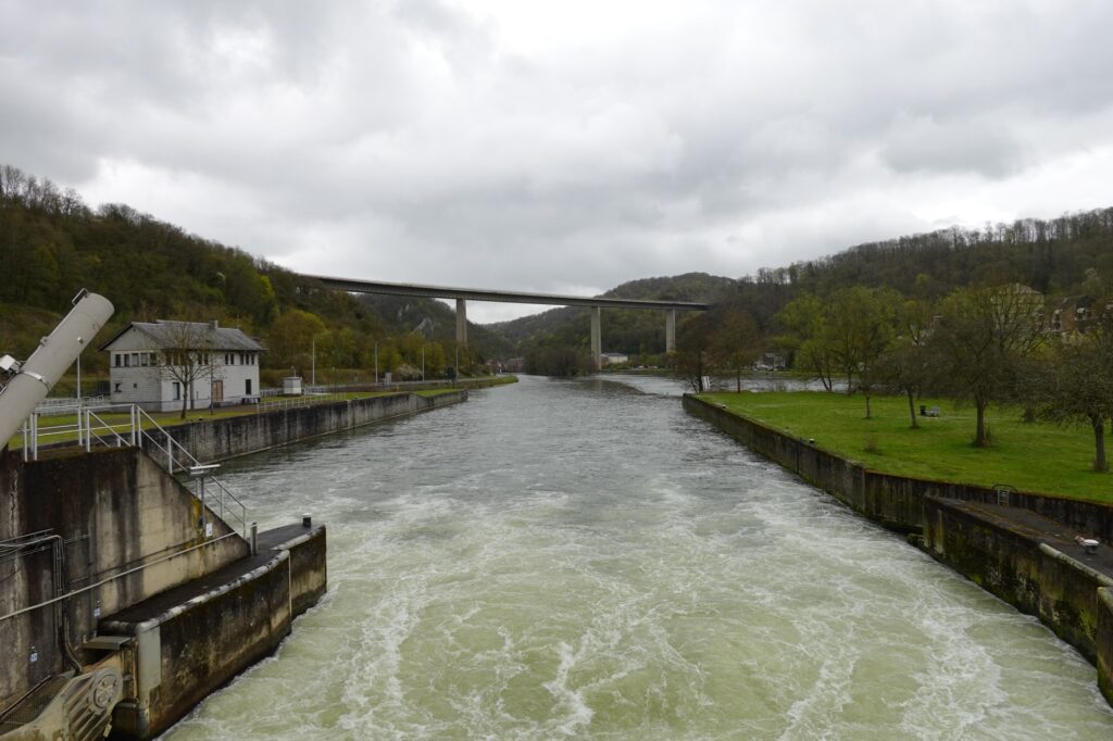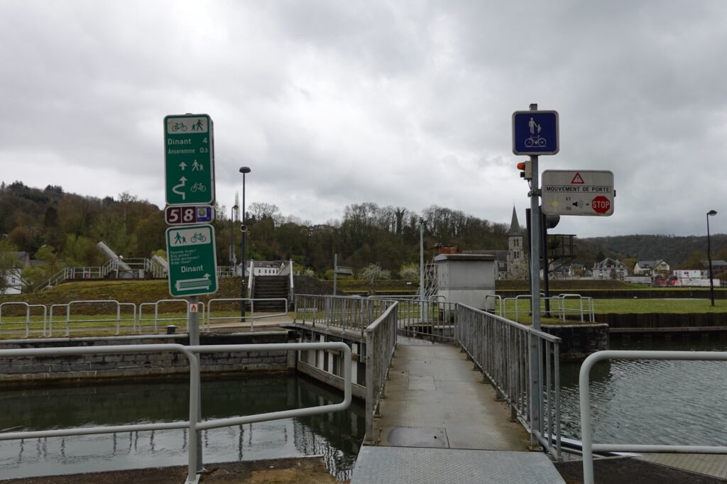 A cet endroit de la Meuse, les écluses sont immenses et nous sommes même amenés à les traverser à vélo. En voilà d’ailleurs une qui se présente à nous. On nous prévient d’un passage étroit mais aucun souci, ça passe tranquille.