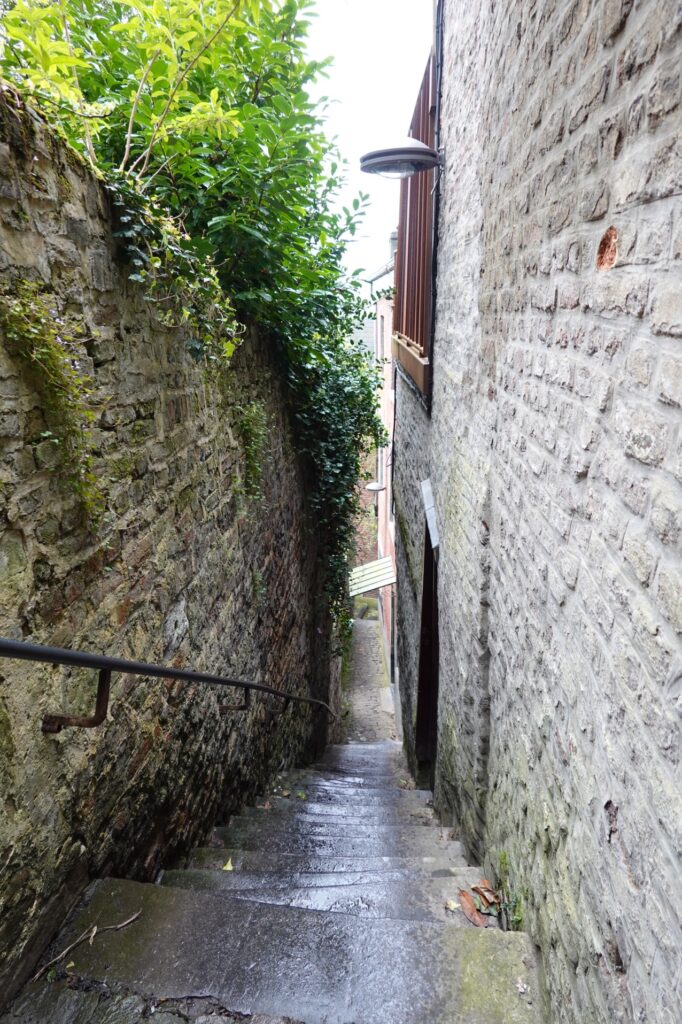 Nous terminons par l’impasse des Ursulines, la plus profonde des sept impasses qui existent encore à la base du versant des Coteaux. Sinueuse et pleines de marches, il ne doit pas être évident de ramener ses courses !