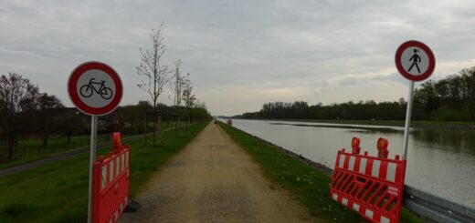 Quelques courses et nous fusons vers le camping. Aïe, à chaque fois, nous traversons une zone de travaux non loin de ce dernier. Ce coup-ci, un homme est là et interdit aux gens de passer sur les 20 mètres fermés (y compris piétons et cyclistes). Pfff… Ça risque de nous faire un bon détour alors que nous sommes juste à côté. Nous voyons des cyclistes passer dans l’autre sens, s’arrêter juste devant la barrière et tenter de négocier avec le « responsable ». Elles parlementent, il parle d’appeler la police. Ni une ni deux, Papa déplace la barrière, les cyclistes passent et nous nous faufilons. Le monsieur n’est pas content, nous ne nous retournons pas et filons. Peut-être qu’il mettra ses menaces à exécution, mais franchement… Avant qu’on nous retrouve… Nous décidons de prendre le risque.