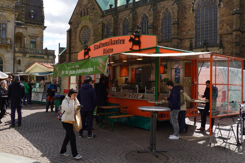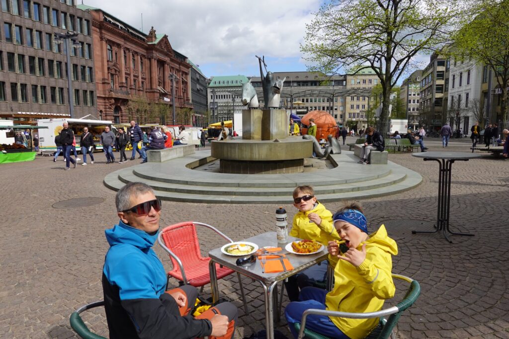 Il est 12h45, nous sommes sur la Marktplatz et voyons des petits stands avec de la nourriture aguichante, nous décidons donc de déjeuner de suite. Pour les enfants, frites avec saucisses au ketchup/curry, pour les parents, des épinards, de la purée et des oeufs aux plats. C’est super bon et copieux, nous partageons 2 assiettes pour 4.