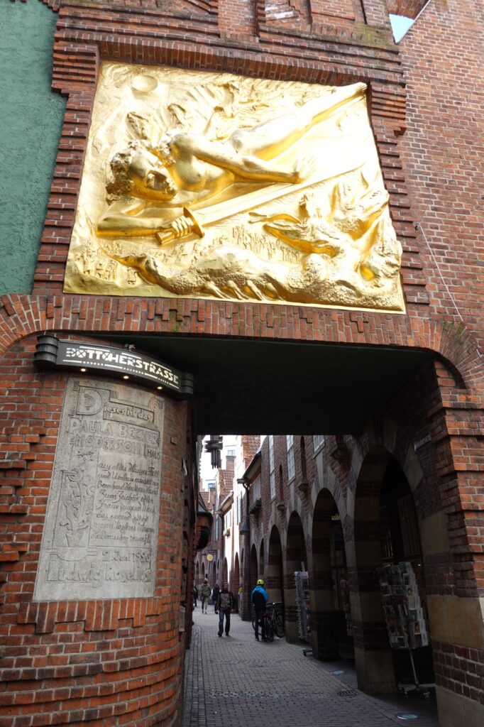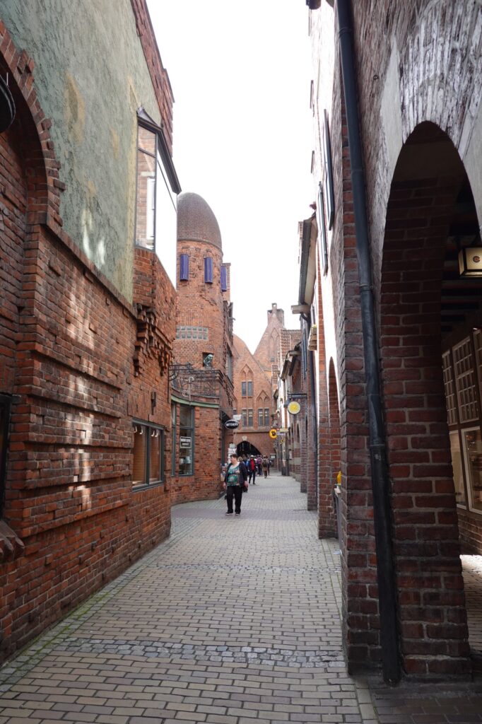 Nous nous dirigeons ensuite vers Böttcherstrasse (rue des tonneliers), plutôt étroite. Nous tombons sur plusieurs groupes d’enfants dont certains parlent français. Là encore, nous apprécions le décor. Au milieu se trouve le carillon de la Haus avec toutes ses cloches et un bout de sa tour qui tourne pendant les mélodies. Nous l’avons écouté sonner pendant plus de 5 minutes et ce n’était pas fini !