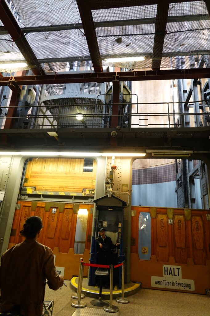 Un coup d’ascenseur (capable de transporter une voiture) et nous voilà sous terre (et sous l’eau), là encore, il y a du monde. Quelle drôle d’expérience !