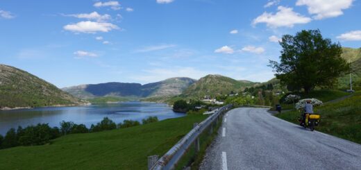 Le tour au centre commercial terminé, nous pouvons nous mettre en route. Nous avons la possibilité de prendre un bateau passagers à Ålesund pour Hamnsund. Ceci raccourcirait le trajet mais nous décidons de pédaler. Il fait beau, profitons-en. Nous voilà donc partis pour nous rendre tout au bout du bras de mer, à Tennfjord pour revenir ensuite sur un autre rivage dans l’autre sens.